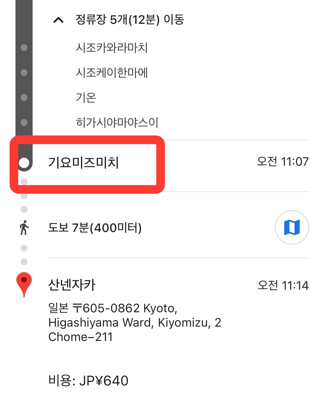 구글맵에서 가장 빠른 경로로 '오사카우메다'(한큐 교토선)을 타고 마지막엔 '기요미즈미치'라는 버스 정류장에서 내린다고 검색결과를 안내해 주었습니다.