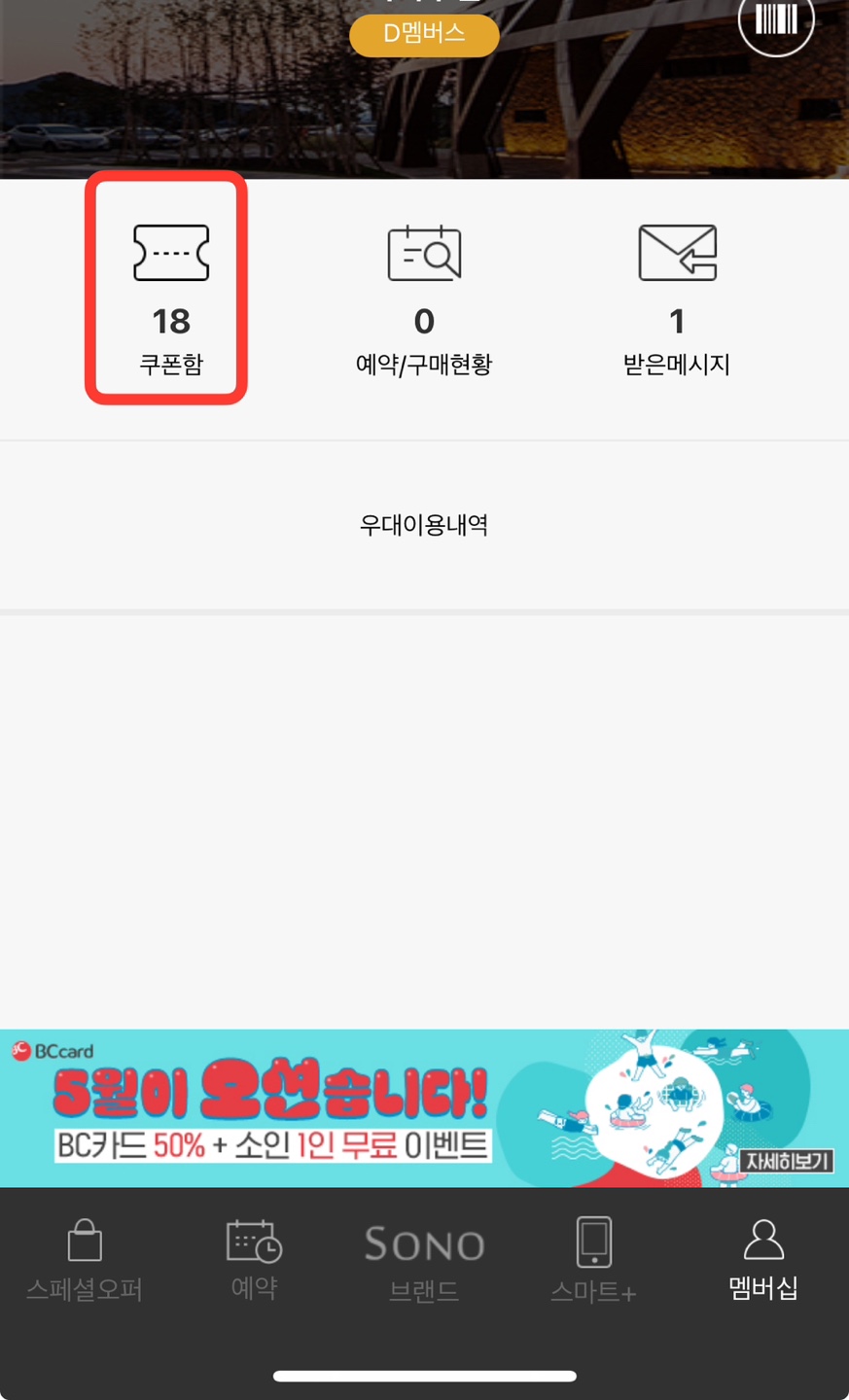저는 이미 신규가입 쿠폰을 사용해서 거제 소노캄 쿠폰이 뜨진 않지만, 사용하시지 않은 분들은 쿠폰함에서 할인쿠폰을 확인해 보실 수 있습니다.