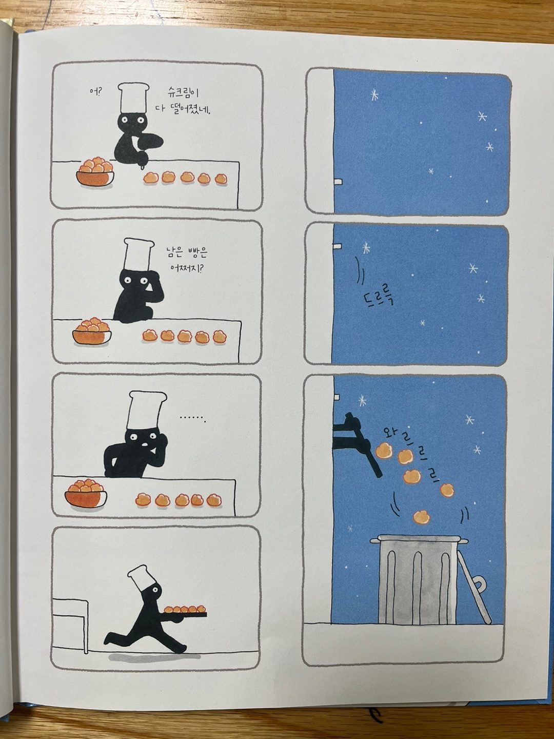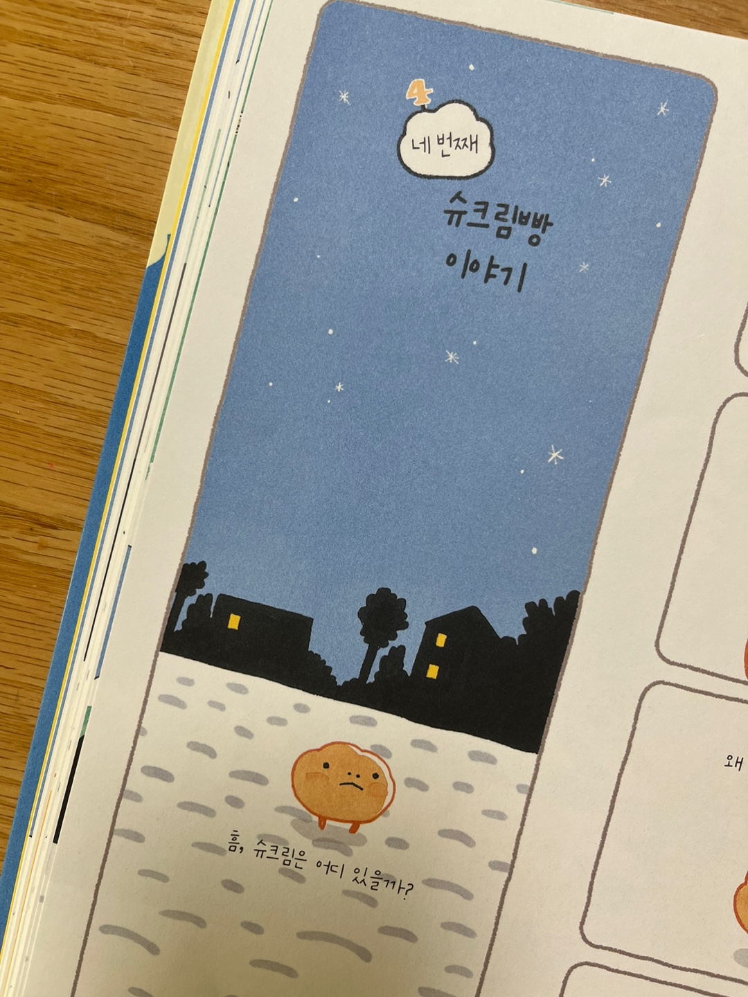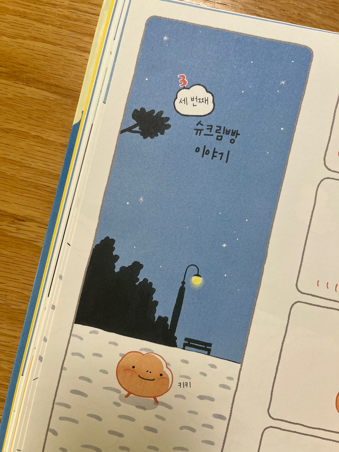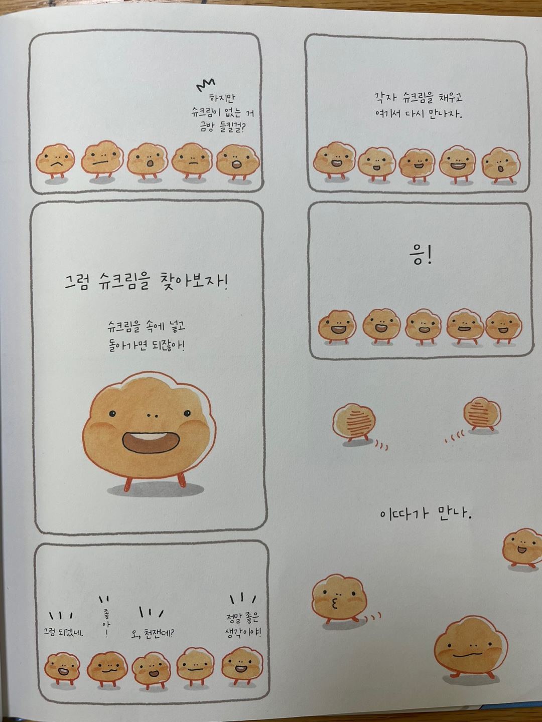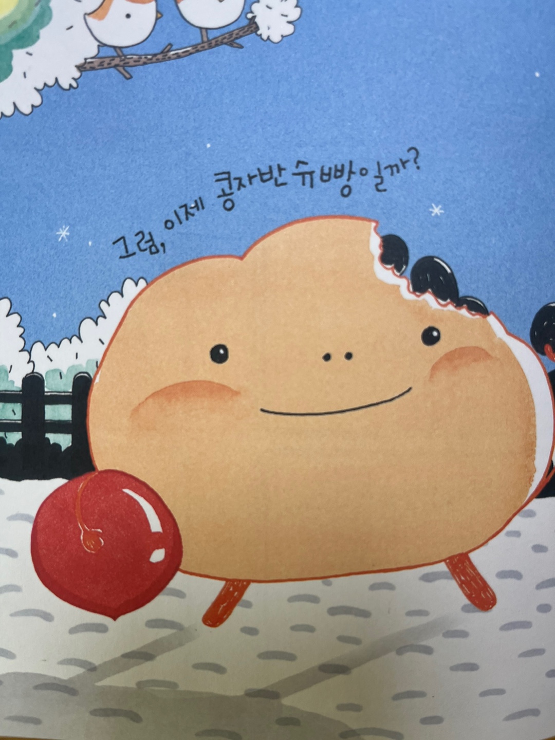 그럼에도 불구하고 작은 슈크림빵이 빵빵해졌습니다. 콩자반 소를 가득 채웠고요. 어쨌든 슈크림은 아니지만 행복해 보입니다. 세 번째 슈크림빵에게 어떤 일이 있었을까요? 그건 책에서 확인해 보시길 바랄게요 :)