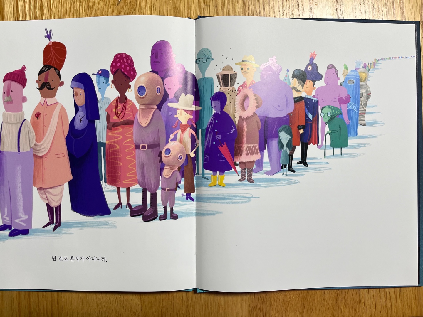 아이를 안고 있는 아빠의 뒤로 사람들이 줄지어 서있습니다. 책장을 한 장 더 넘기면 끝없이 줄이 이어집니다. 우리는 결코 혼자가 아님을 깨닫게 해주는 장면입니다. 그들의 인종, 국적, 성별, 나이, 어느 하나 같은 게 없지만 우리는 혼자가 아니며, 이 아이는 모두와 함께 살아갈 것입니다.