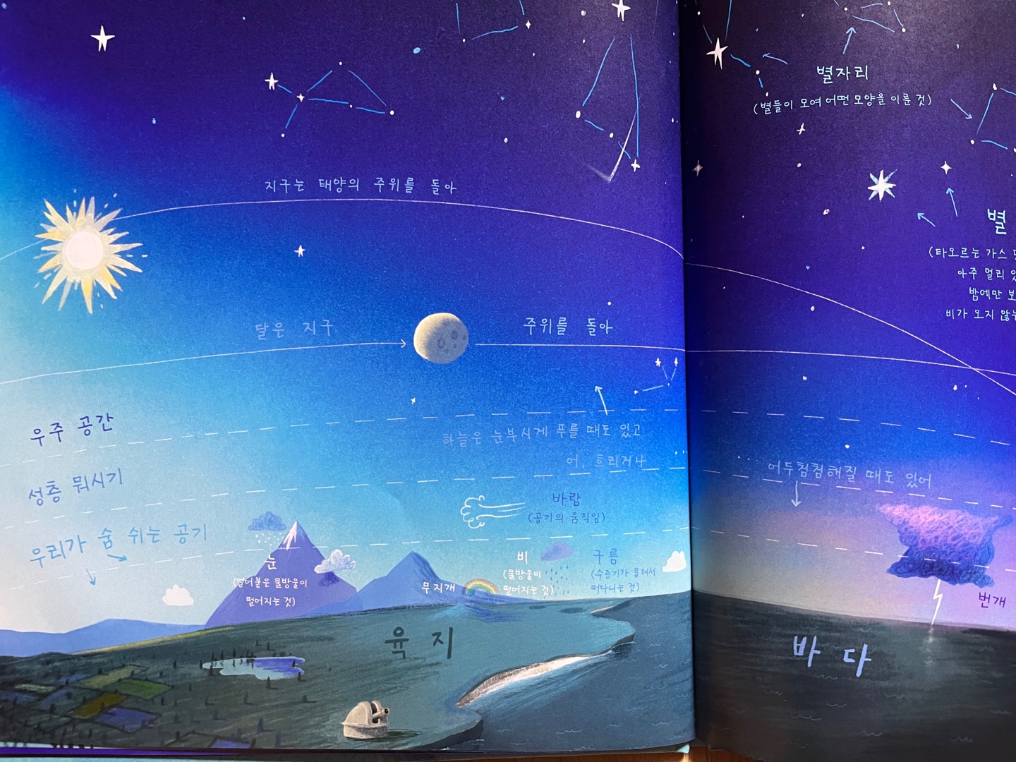 지식책의 의무를 성실히 해 내면서, 동시에 작가가 사랑을 담아 써내려간 전체를 아우르는 이야기가 깔려있음을 마지막에 알게 됩니다. 우주공간에서부터 지구, 그 속의 땅과 바다, 수많은 사람들과 작은 동물들까지 지구에 존재하는 것들, 심지어 그 위에 있는 시간까지도 순차적으로 보여줍니다. 지식 그림책이 재미와 감동, 철학까지 있긴 쉽지 않은데 이 어려운 걸 해내신 작가님 존경합니다.