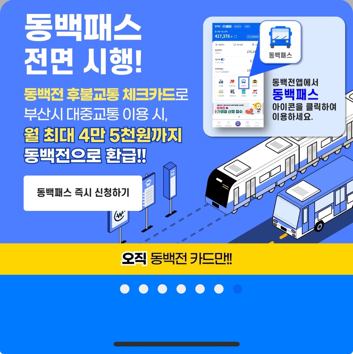 부산시 대중교통을 월 4만 5천원 초과하여 사용할 시, 최대 4만 5천원까지 동백전으로 환급받을 수 있습니다.