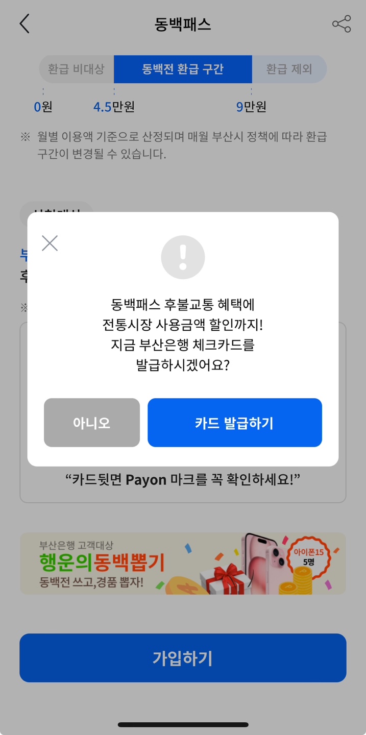 동백패스 설명 아래에 파란색 '가입하기'를 탭 하시면, '부산 동백전 체크카드'를 바로 신청할 수 있습니다.