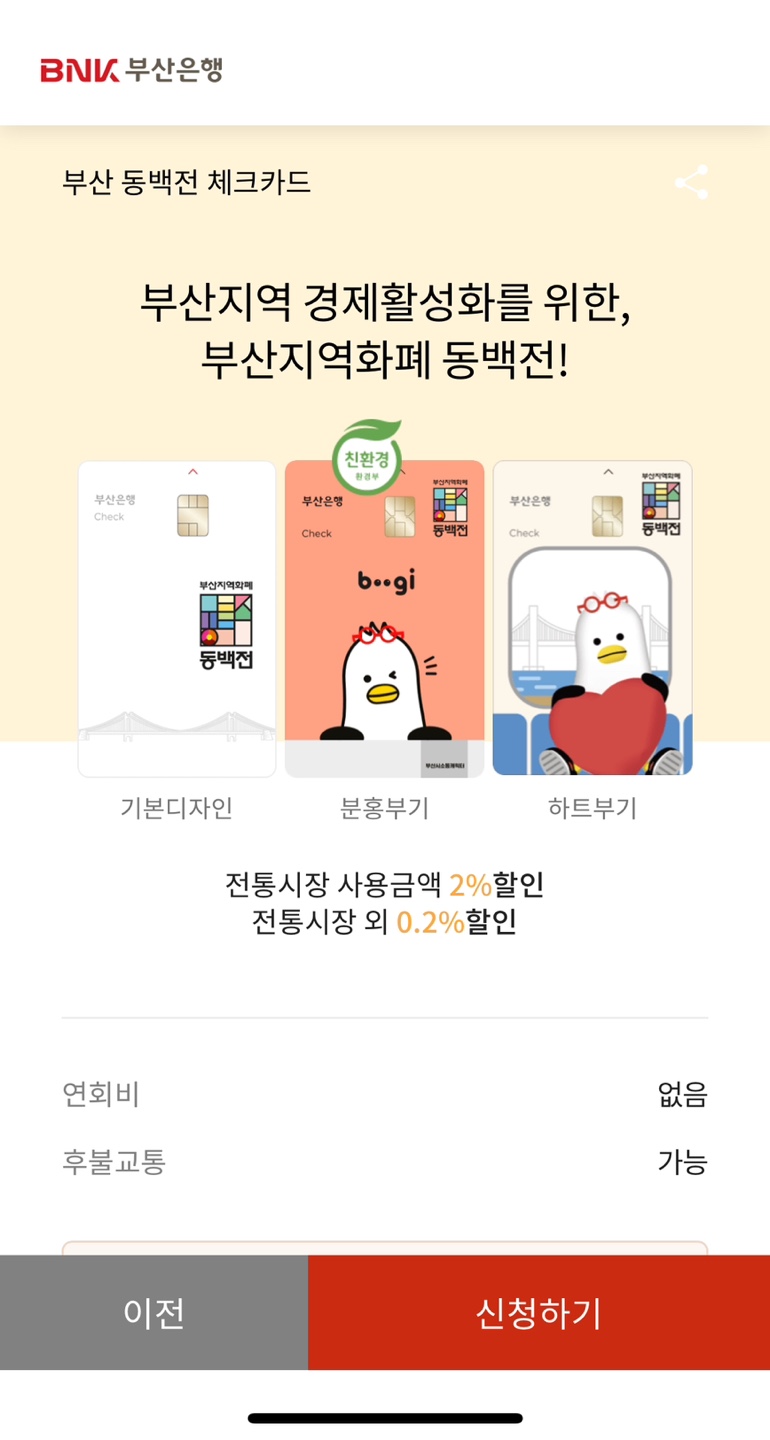 저는 첫 동백전 카드를 만들 때 '코나아이'로 발급받았는데, 작년에 '부산은행'으로 재발급 받았습니다. 카드를 변경해도 동백전 앱에서 잔액과 정보가 이관됩니다. 최근 '동백패스' 교통카드 기능도 추가됐으니 '부산은행 동백전 카드'로 발급받아 편리하게 사용하시면 좋을 것 같습니다 :)