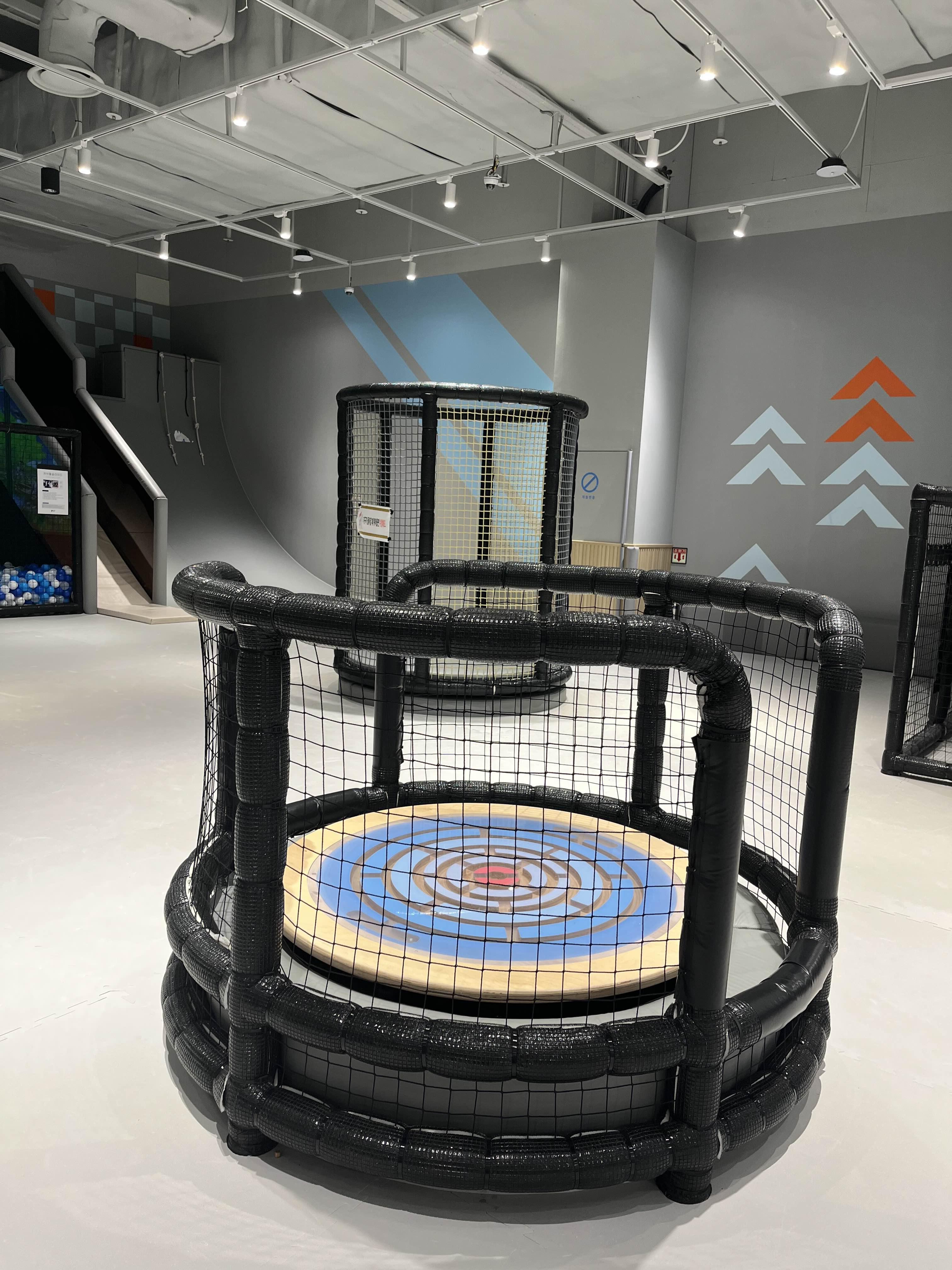시작 지점의 빨간 그물망에 매달려 짚라인처럼 타는 놀이기구입니다. 다른 한쪽은 징검다리를 건널 수 있게 만들어져 있습니다. 아래에 매우 푹신한 매트가 두텁게 깔려있어 일부러 떨어지는 아이들도 있을 정도입니다.