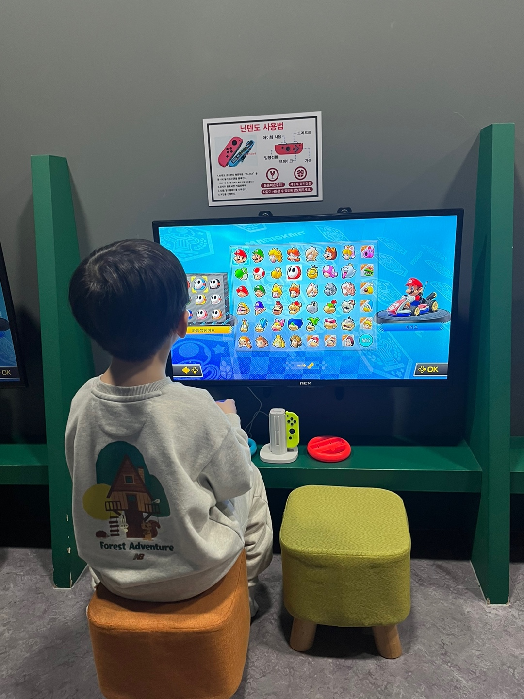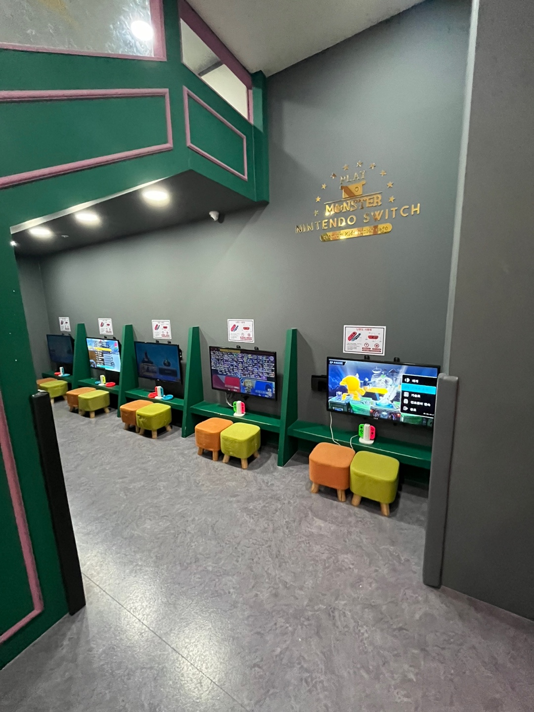 두 명씩 짝지어 닌텐도 게임을 할 수 있는 닌텐도 스위치 존이 따로 있습니다. 닌텐도가 여러 대 구비되어 있기 때문에 여러 친구들이 함께 이용해 보는 것도 재미있을 것 같네요.
