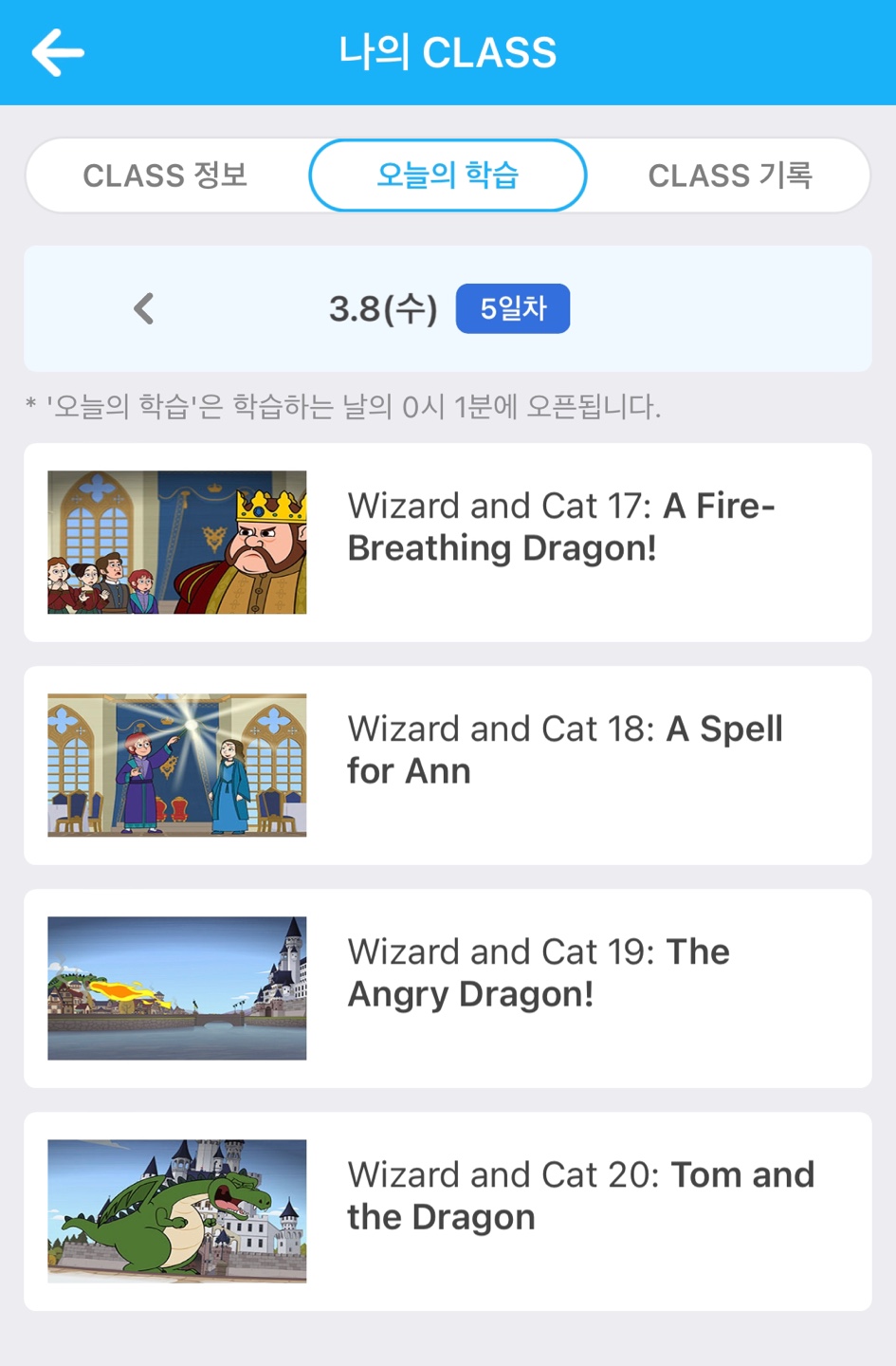 학기 초여서 정신없는 통에 클래스를 이틀이나 빼먹었네요. 피치가 선택한 3단계 동화 wizard and cat은 하루 4개의 애니메이션을 시청하면 됩니다.