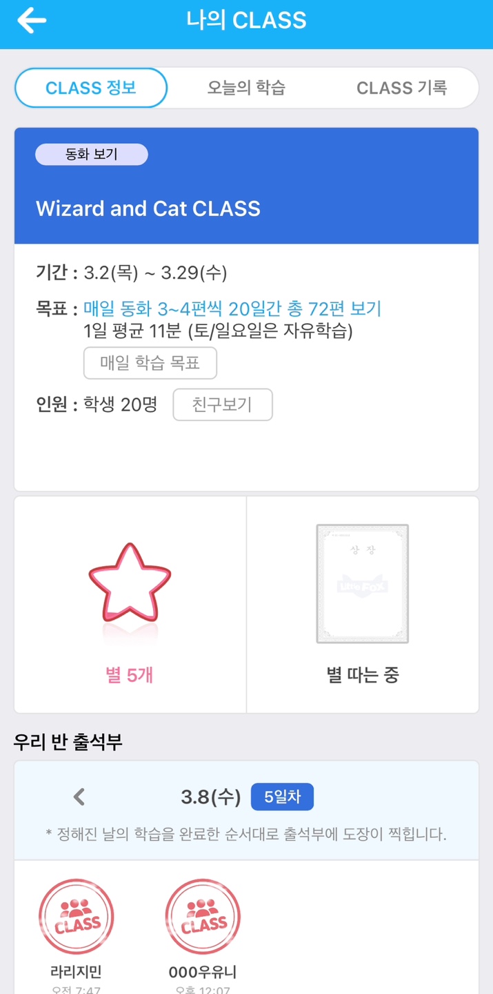 '동화 읽기' CLASS 중 CLASS정보 카테고리를 보면 기간과 목표, 함께하는 인원을 볼 수 있습니다. 피치는 현재 별 5개를 땄고 별이 일정량 충족되면 상장을 프린트할 수 있도록 버튼이 활성화됩니다.