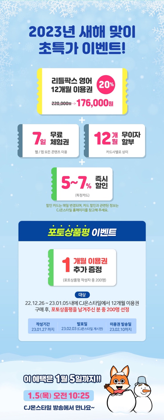 온라인 영어 도서관 '리틀팍스' 핫딜 소식 알려드립니다. 최근 가격 인상이 되어 아쉬웠는데 새해를 맞이하여 CJ onstyle 홈쇼핑에서 20% 할인 이벤트를 한다고 해요.