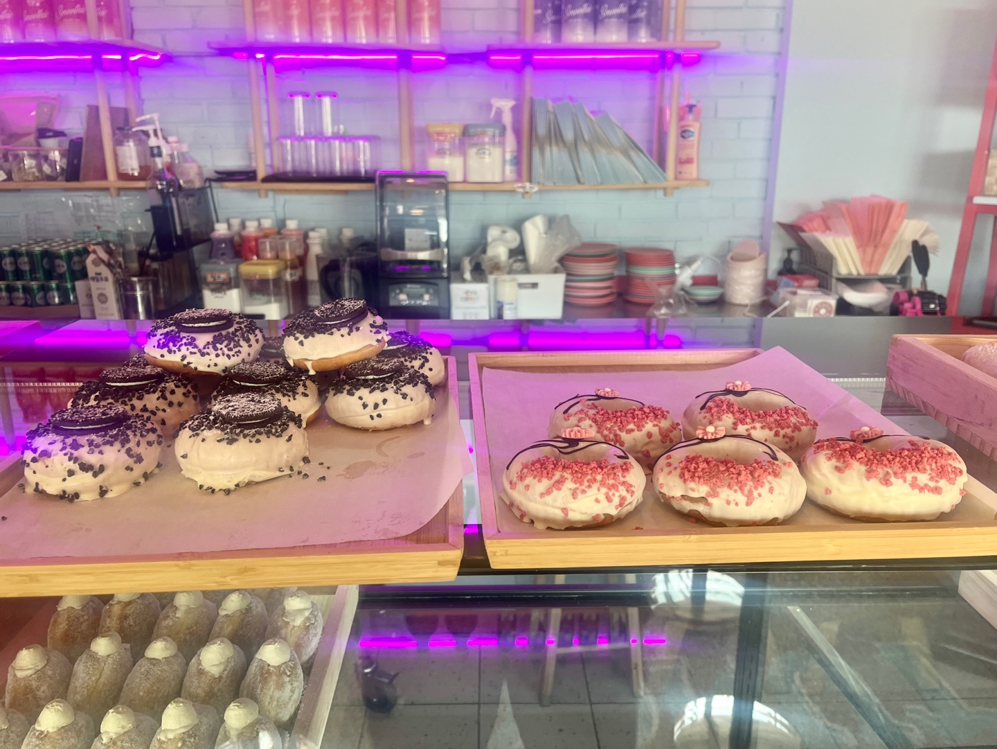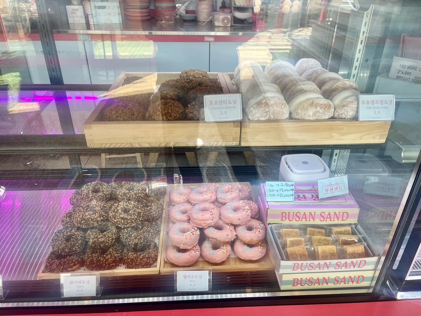 진열대에 쌓여있는 이 곳의 시그니처 도넛인 핑크빛 '앨리스 도넛'도 맛있습니다. 라즈베리 베이스에 앨리스 레터링이 앙증맞게 새겨져 있어요. 요즘 부산에서 핫하다는 부산 바다샌드도 보입니다. 해리단길에 있는 부산 바다샌드를 먹어본 적이 있는데 저는 그냥 쏘쏘였습니다.