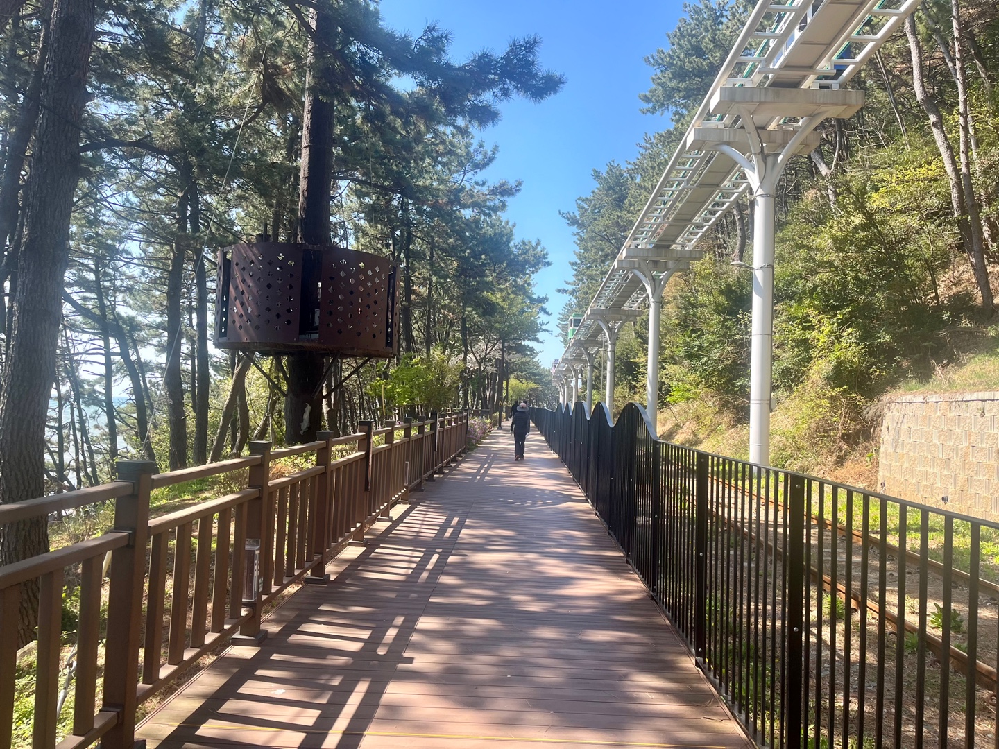 산책하기 좋은 나무데크를 거닐다보면 한쪽으론 예쁜 바다가, 다른 한쪽엔 숲과 해변열차가 보입니다. 날씨에 따라 달라지는 풍경이 매력적입니다. 해변열차에서 감상하는 바다도 멋지겠지만, 시원한 파도소리와 은은한 숲 향기를 맡으며 산책하는 건 또 다른 매력이 있어요.