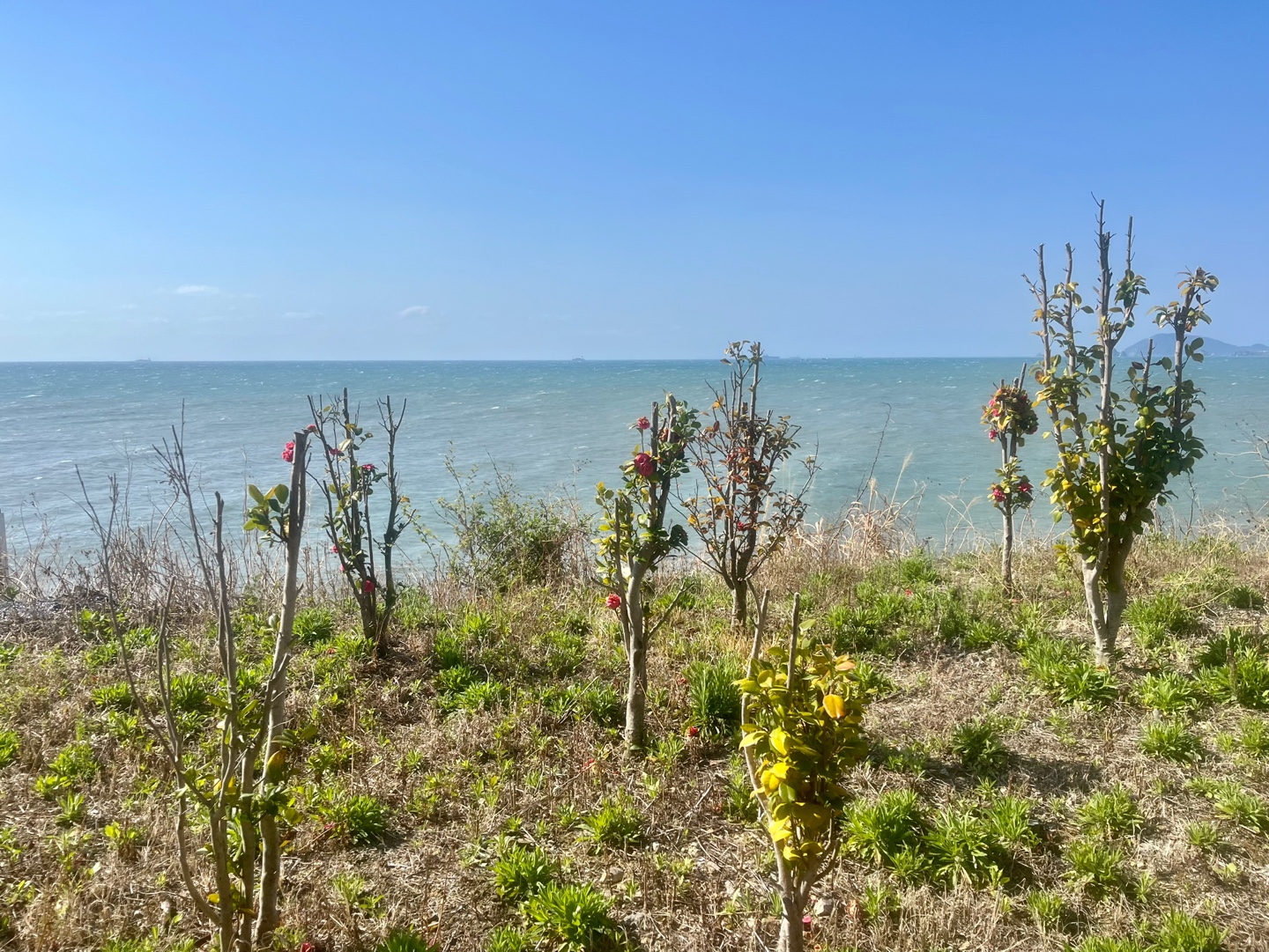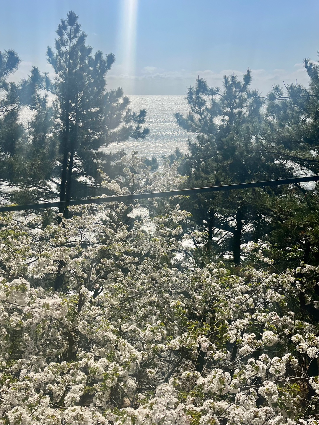 부산은 이미 벚꽃이 다 졌어요. 그런데 걷다 보니 조금 남아있는 산벚꽃이 있어 한참 바라봤습니다. 멀리 샛노란 유채꽃도 보입니다. 사진에는 없지만 '바다소리 갤러리'쪽에서 잠시 쉬어갈 수 있는 벤치도 있습니다. 이 포인트도 꽤 절경이라 쉬면서 경치를 감상해 봐도 좋을 것 같아요.