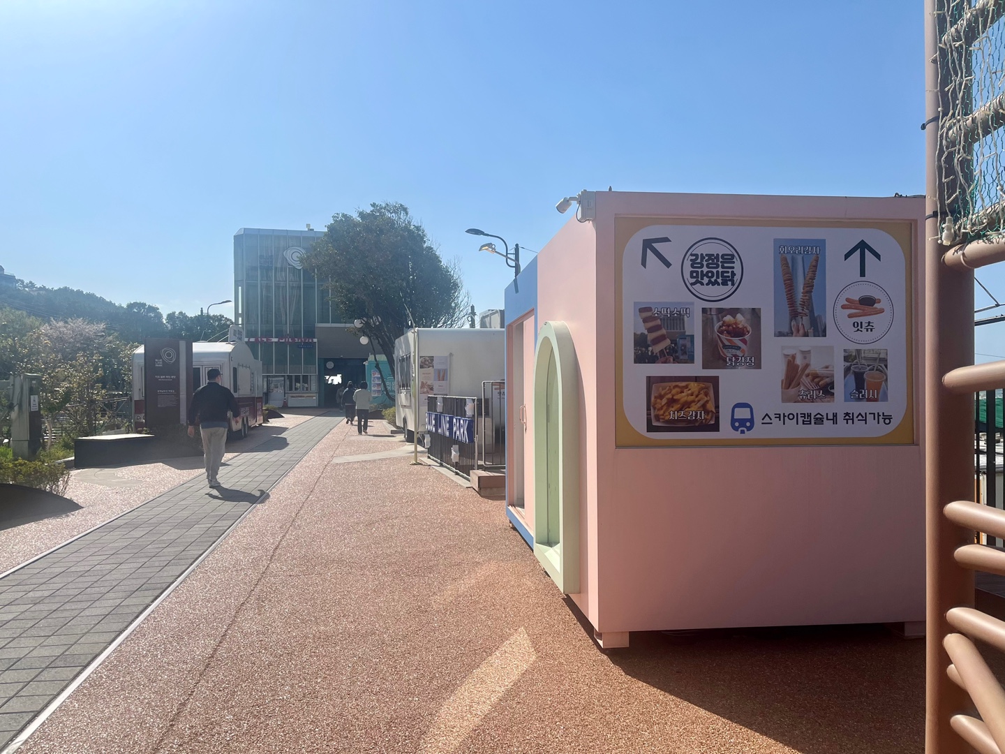 정거장 바로 앞까지 걸어가면 푸드트럭들이 있습니다. 닭강정, 어묵, 츄러스, 회오리감자, 슬러시 등등 간단한 먹거리들이 있어요. 9시쯤 갔더니 푸드트럭들은 아직 문을 열지 않았습니다.