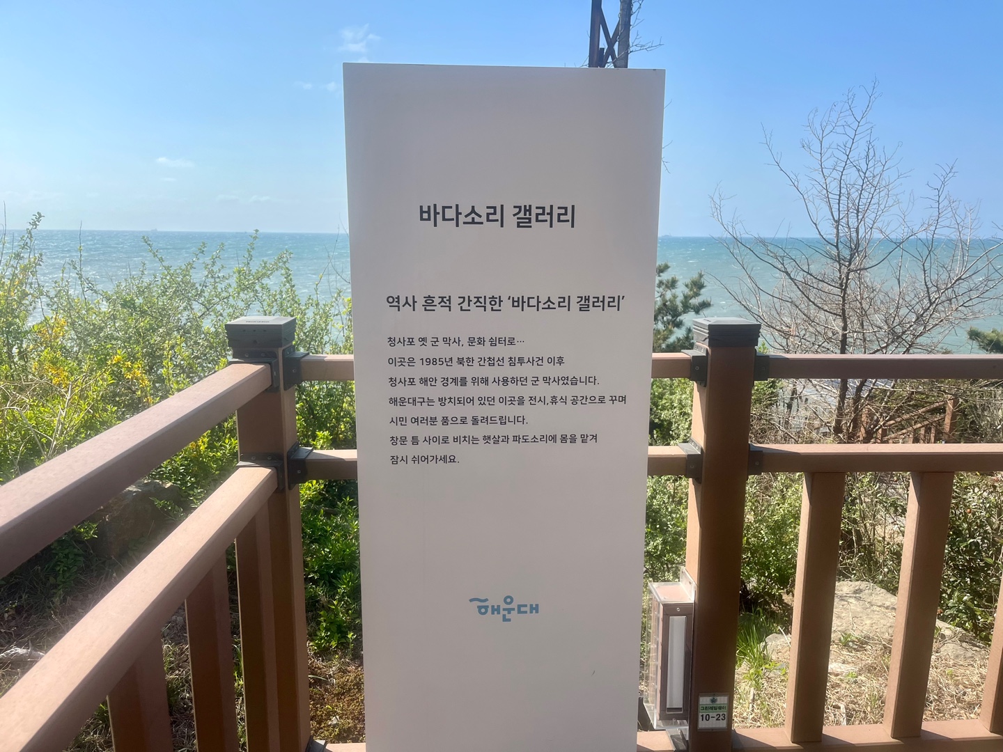 멀리 동백섬과 광안대교가 보입니다. 낮에도 아름답지만 밤에보는 광안대교는 또 다른 매력이 있습니다. 역사적 사연을 간직한 바다소리 갤러리에 앉아 잠시 쉬어가셔도 좋습니다.