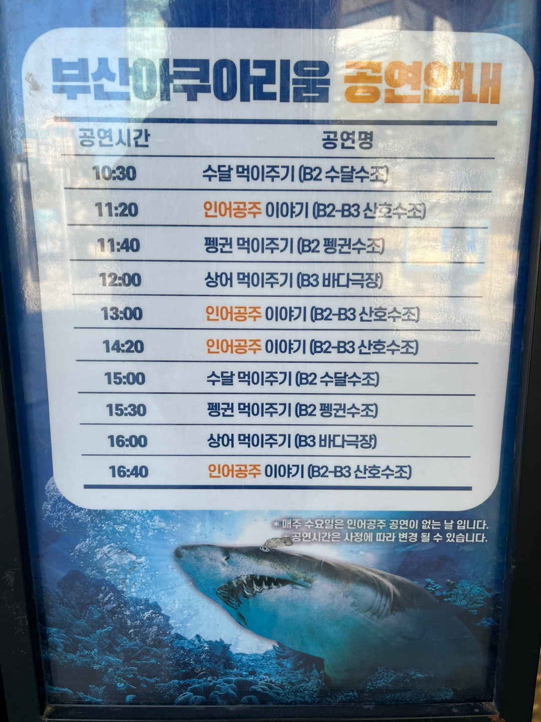 이번에 씨라이프 부산을 방문했을 때 제가 중점에 둔 것은 '공연'이었어요. 공연 시간을 중심으로 동선을 짜고 움직였죠.