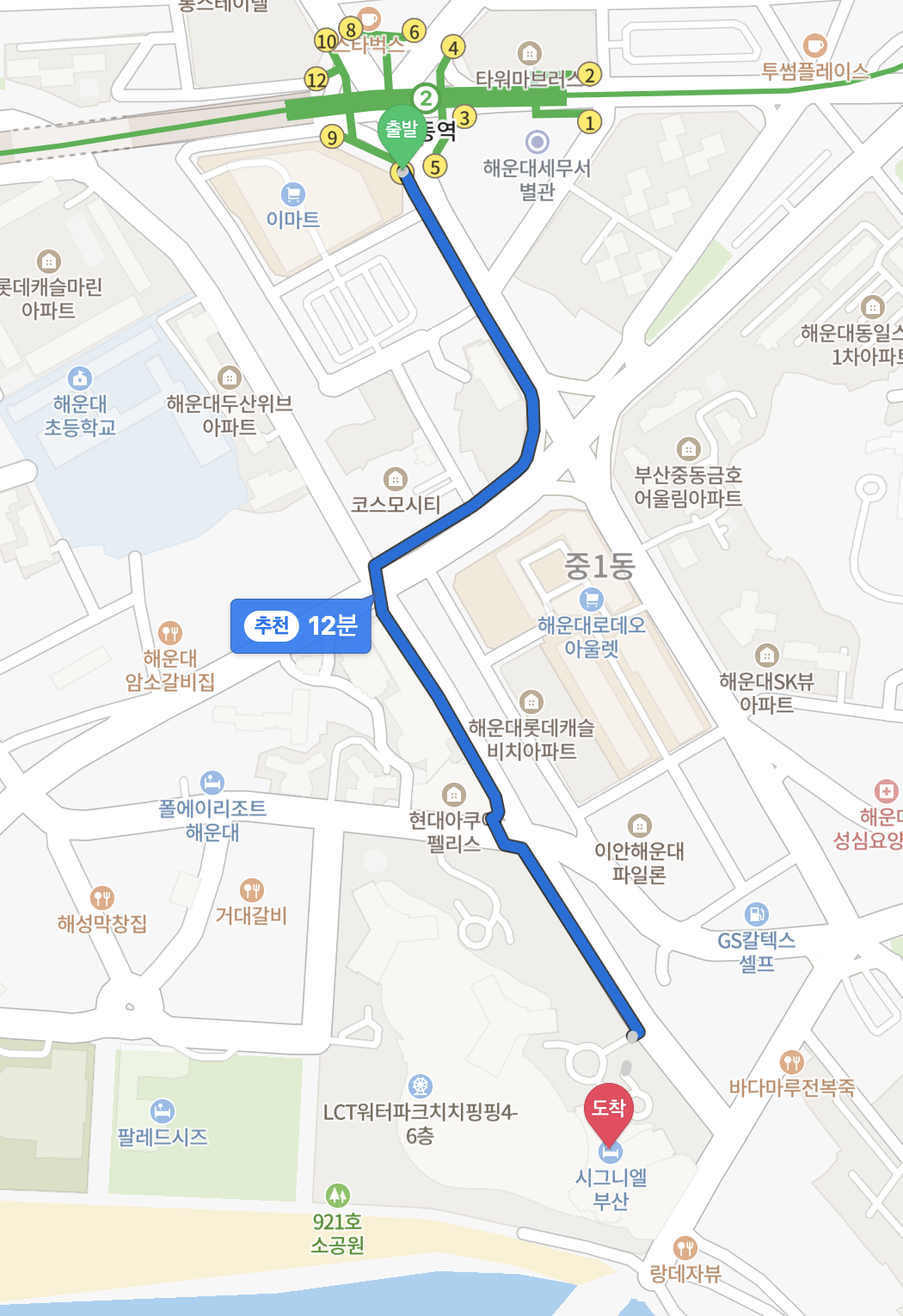 해운대역 3, 5번 출구로 나와 도보 10분 거리 위치
