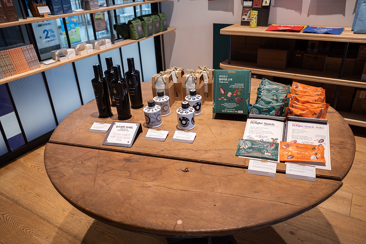 카페 한 켠에서는 테라로사의 다양한 굿즈를 만나볼 수 있습니다. 핸드드립 커피 전문점답게 품질 좋은 원두와 드립백부터 텀블러, 컵, 예쁜 에코백까지 세팅되어 있습니다.