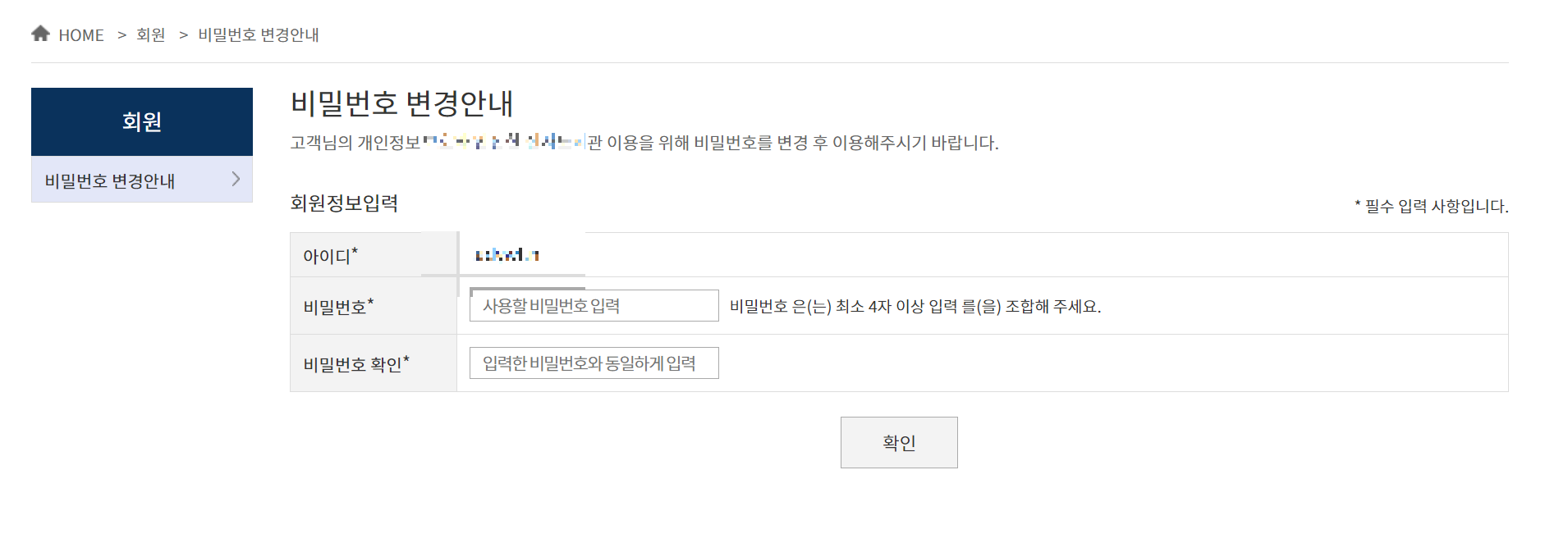 개인정보동의 후 자동으로 '비밀번호변경안내' 페이지로 넘어갑니다.