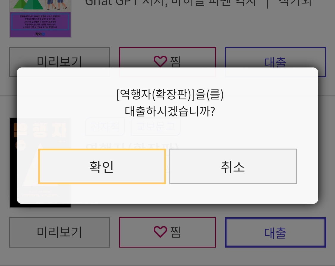 원하는 도서를 선택하여 '대출'버튼을 탭 하시면 책을 바로읽거나 책장에 저장을 할 수 있습니다.