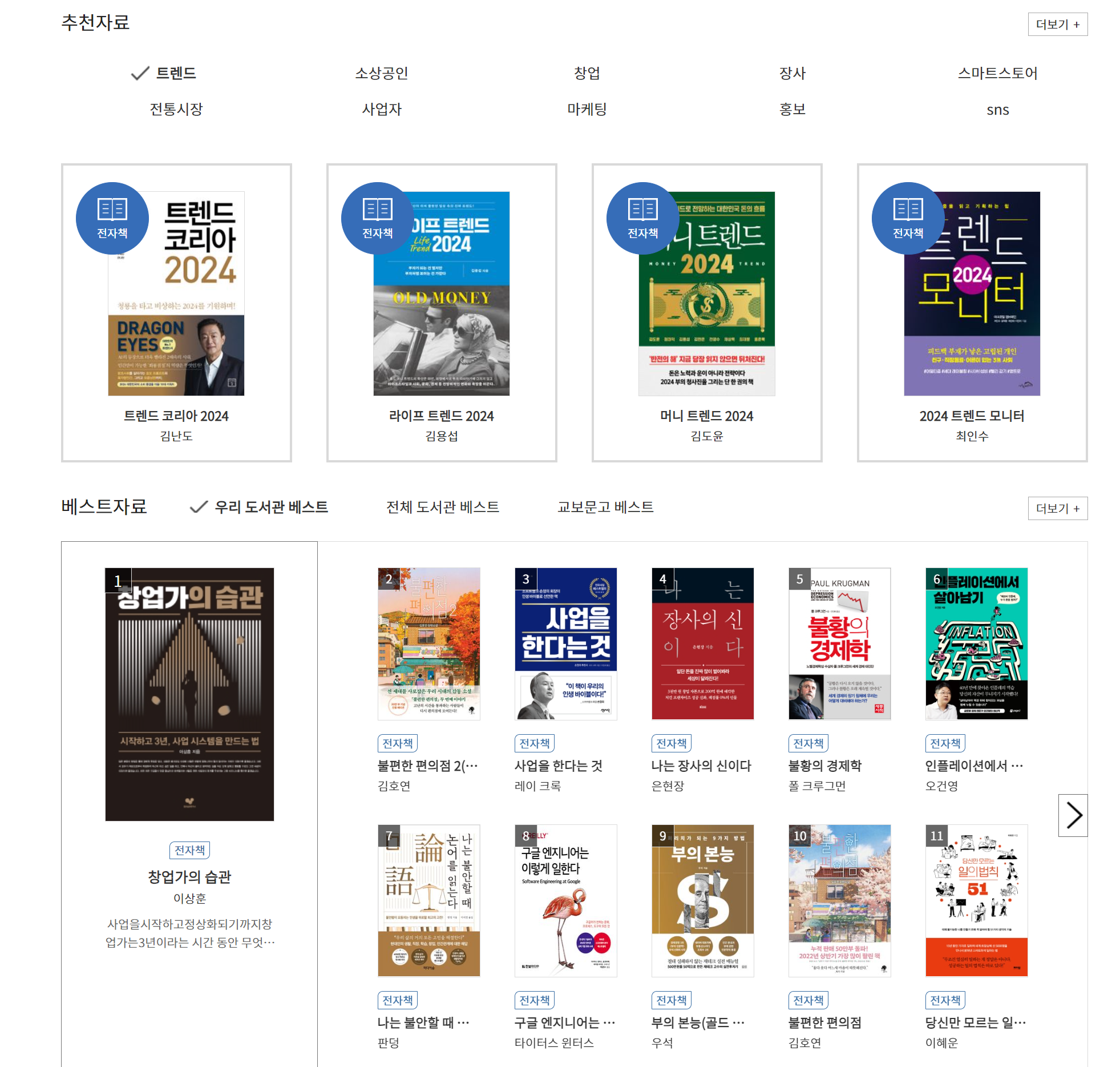 경제경영, 자기개발, 소설, 인문, 역사, 정치, 과학, IT, 건강, 요리, 여행, 아동, 외국도서, 매거진 등 모든 카테고리의 책을 이용할 수 있습니다.
