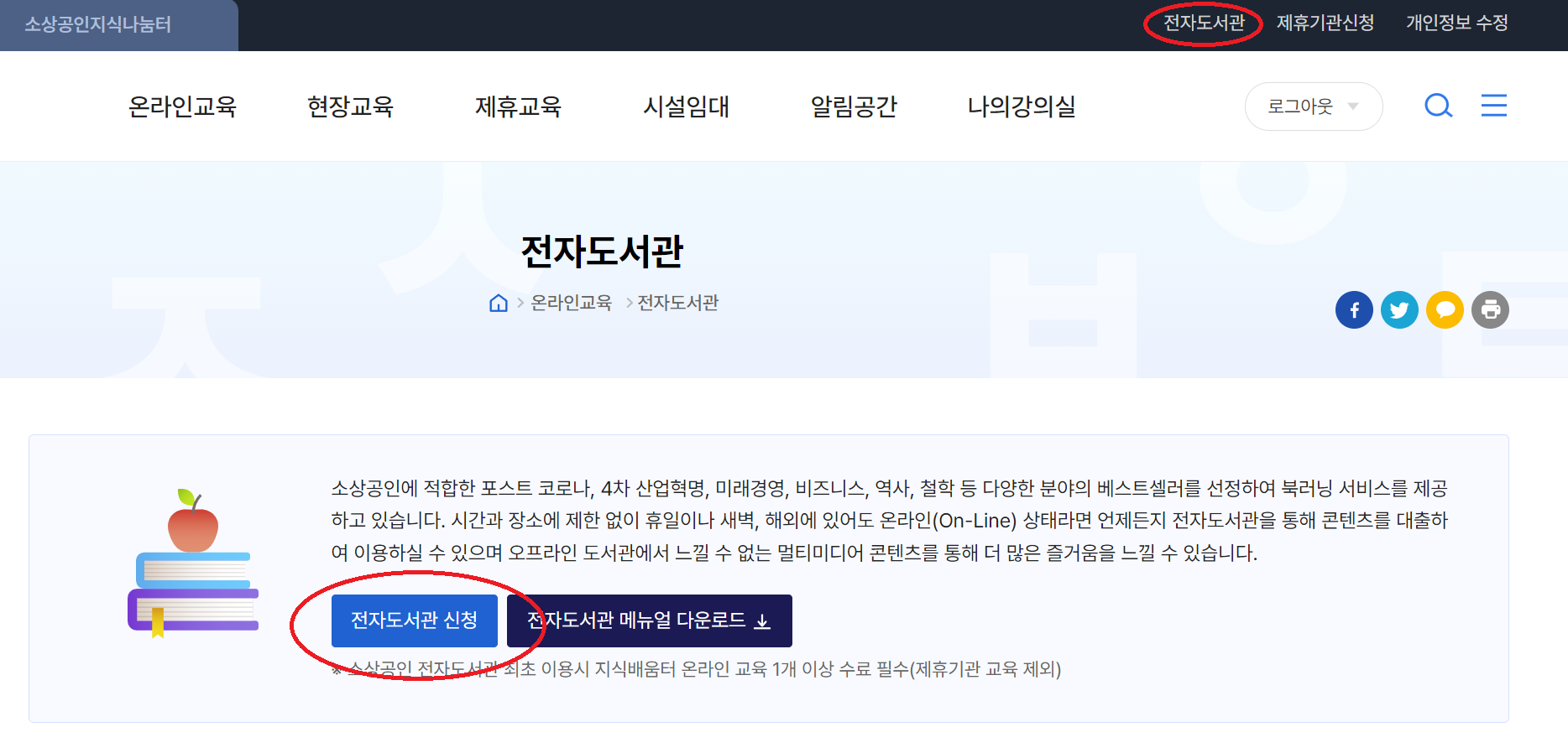 교육 서비스 중 하나로 '전자도서관'을 운영하고 있는데, 사업자가 아니더라도 누구든 가입하여 무료 책 서비스를 이용할 수 있습니다.