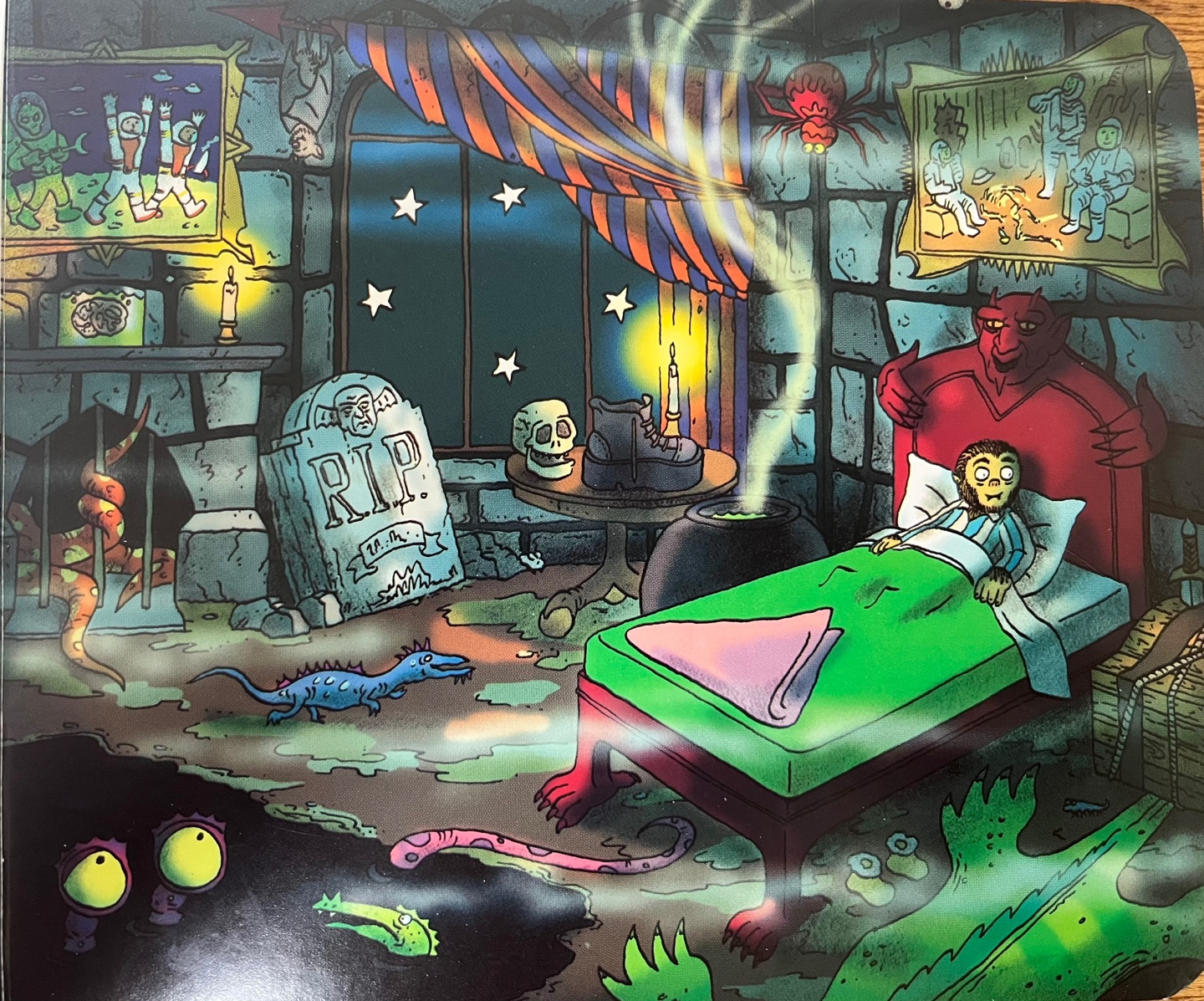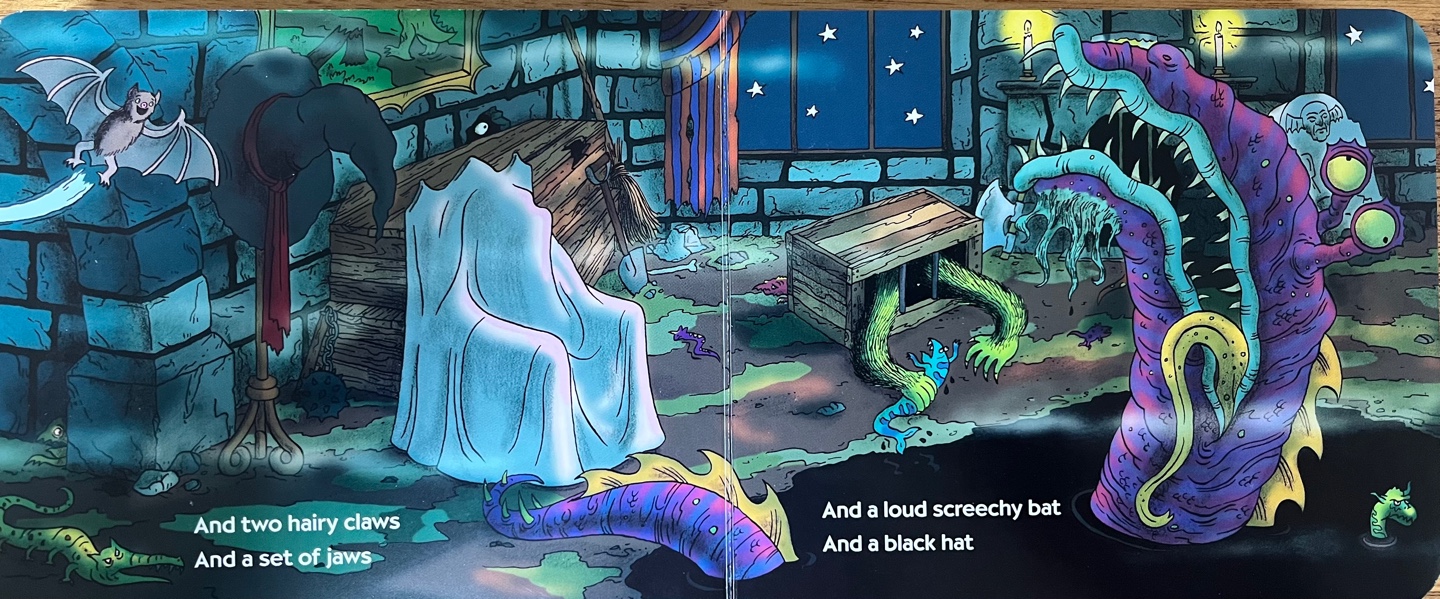 방 안을 좀 더 샅샅이 들여다보니 정말 가관입니다. 썩 마음에 드는 그림은 아니지만 아이들과 숨은 그림 찾기를 하듯 하나한 찾아보는 것도 재미있습니다. 예를들면 'loud screechy bat'은 어딨지? 라고 물으면 두 아이가 경쟁하듯 찾아냅니다.