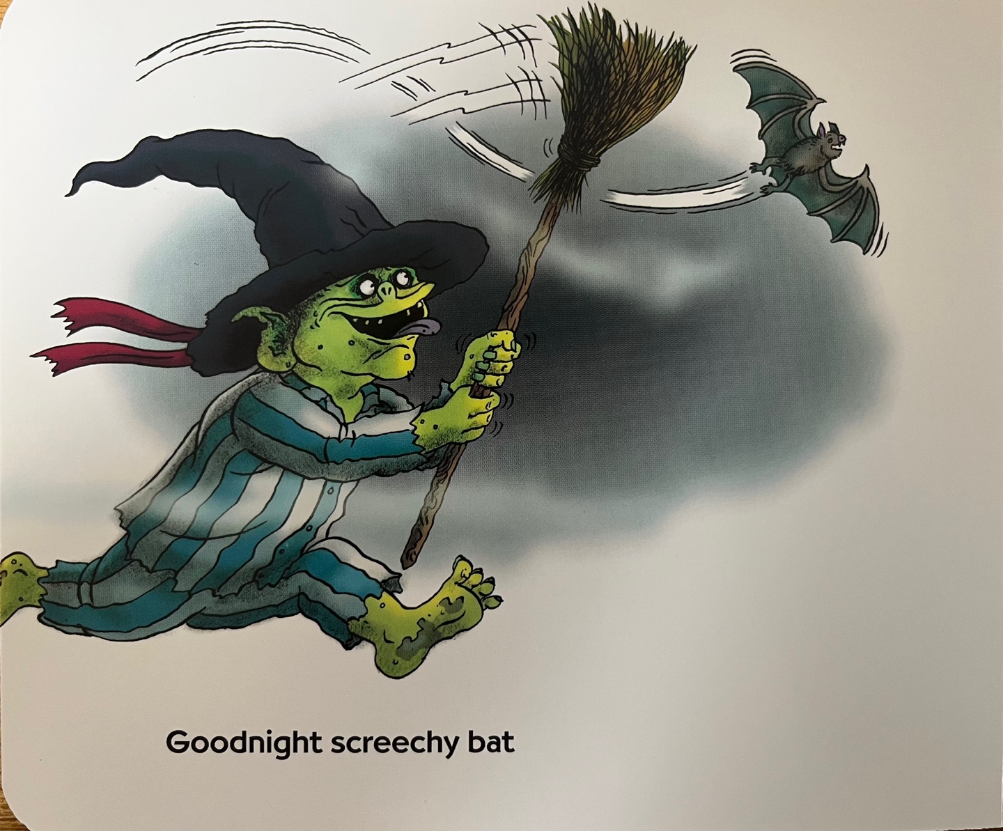 낚시를 끝낸 Goon은 이제 마녀 모자를 쓰고 박쥐를 쫓아 다닙니다. 박쥐도 모자도 모두 굿나잇!