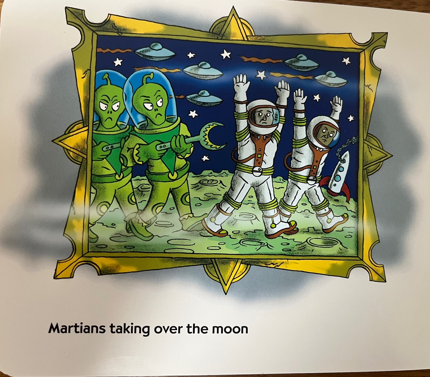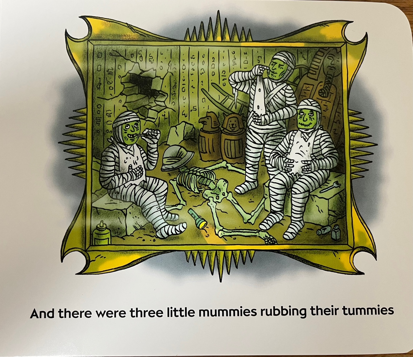 달을 정복한 화성인들이 지구인을 내쫓는 것 같습니다. 다른 한 쪽 벽에 걸린 그림엔 세 명의 미라가 배가 부른지 이를 쑤시며 배를 문지르고 있네요. 무엇을 먹고 저렇게 기분이 좋아 보일까요? 잘은 모르겠지만 바닥에 나뒹굴어다니는 해골이 눈에 띌 뿐입니다.