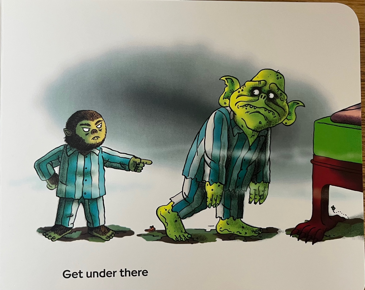 오늘 소개할 'GoodNight Goon'은 아이들이 좋아하는 괴기스런 인물들만 등장합니다. 또한 그림만 봐도 직관적으로 이해할 수 있는 괴상하고 지저분한 일들의 연속이라 깔깔거리며 좋아하네요. 심지어 그동안 여러 번 읽었던 'GoodNight Moon'의 패러디이니 원문의 차분하고 잔잔한 분위기와 대조되어 더 웃음을 터트립니다.