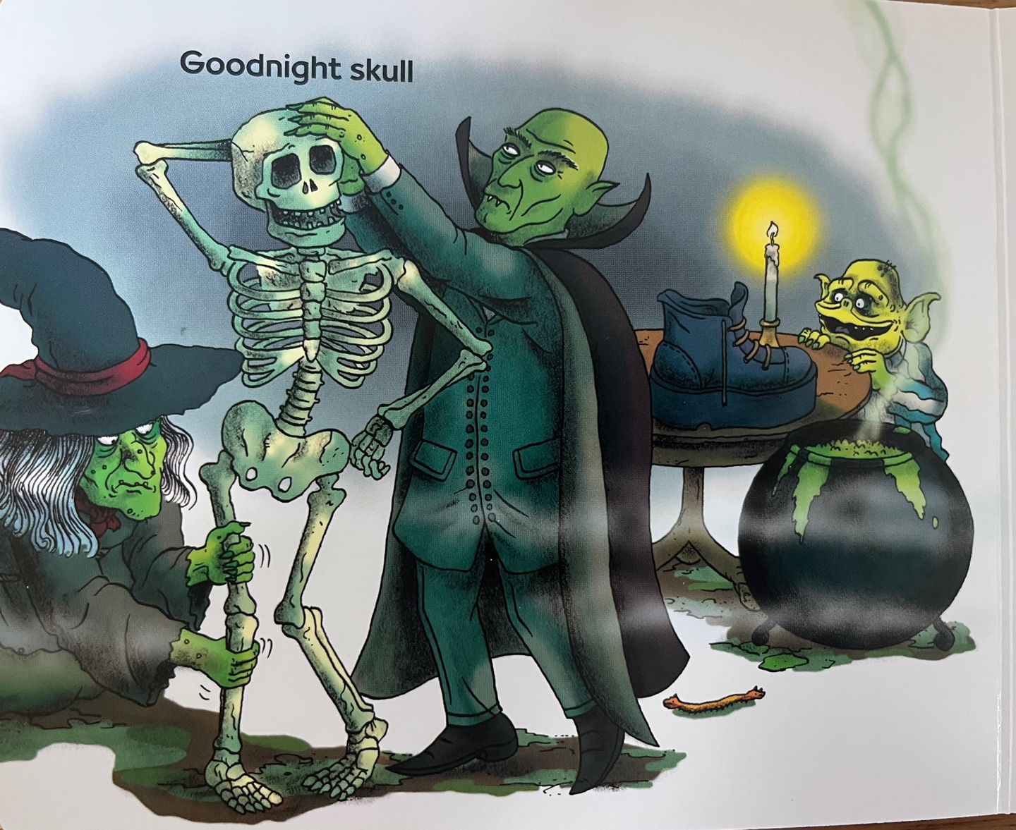 박쥐는 사실 뱀파이어였네요. 마녀와 뱀파이어가 뼈다귀를 잃고 헤매던 해골을 깜끔히 조립해 줍니다. 포즈잡는 해골에게도 Goodnight skull!
