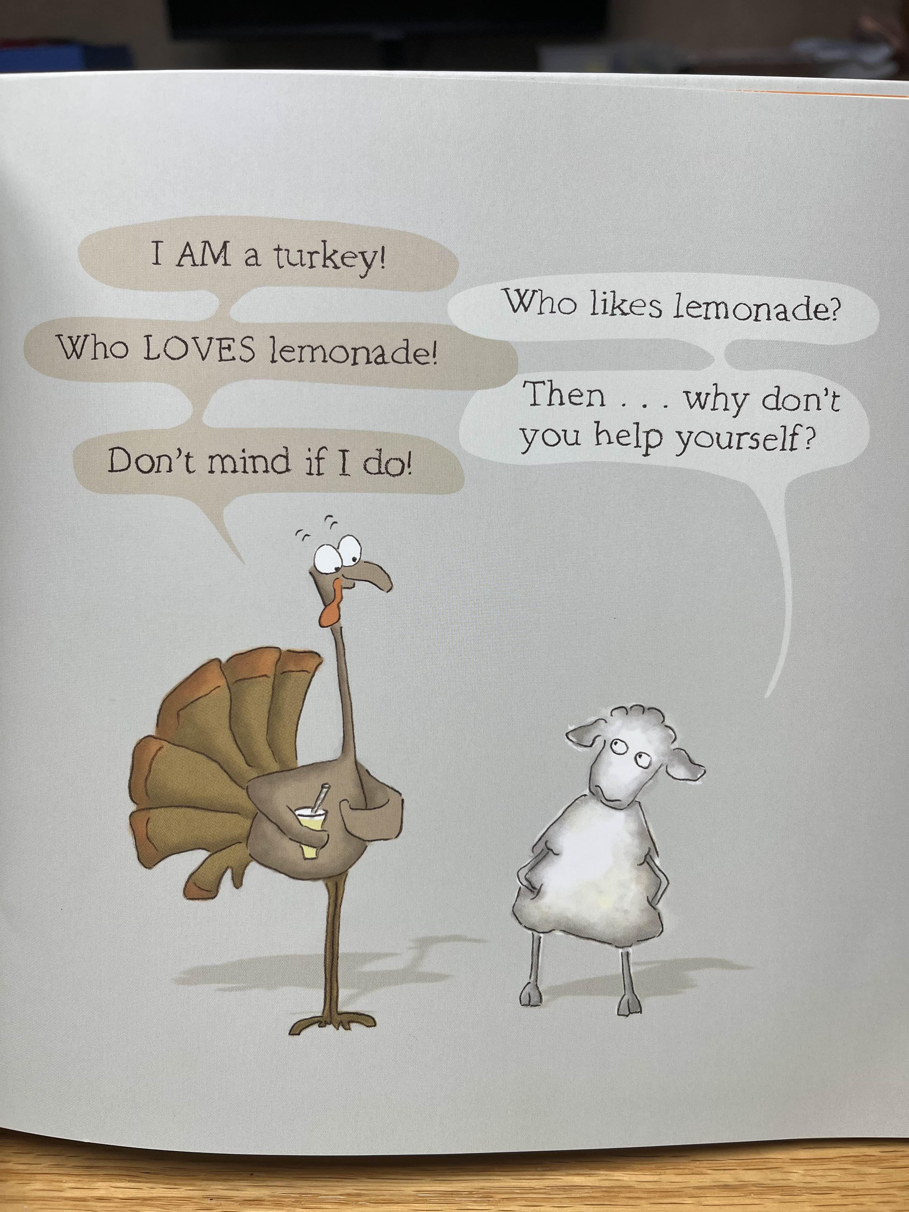 당황한 칠면조는 이것은 분명 레모네이드임을 구구절절이 항변합니다. 그리고 자신도 그 사실을 믿어버리고 맙니다. Baa Baa의 말장난에 휩쓸려버린 것이죠. 흑 슬픈 예감이 슬슬 밀려옵니다.
