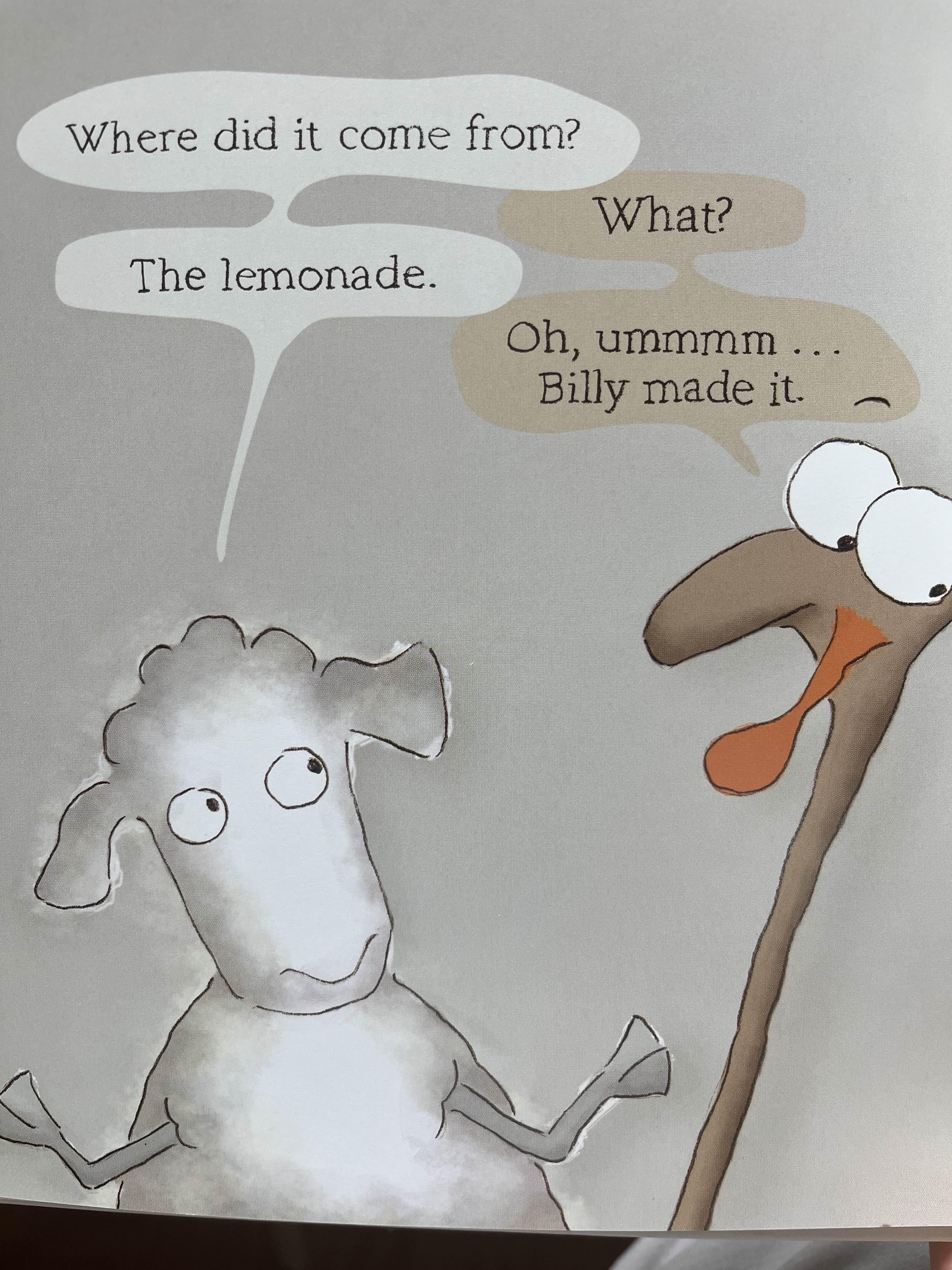 칠면조는 레모네이드를 들고 Baa Baa에게 접근합니다. Baa Baa는 칠면조가 들고 있는 컵의 정체를 궁금해하죠. 칠면조는 복수를 꿈꾸며 엉큼하게도 이 컵에 들어있는 음료수는 염소 빌리가 착즙한 레모네이드라고 거짓말을 합니다. 물론 빌리가 만들어 낸 것은 맞습니다. 레모네이드와 비슷한 다른 것이지만요 :)