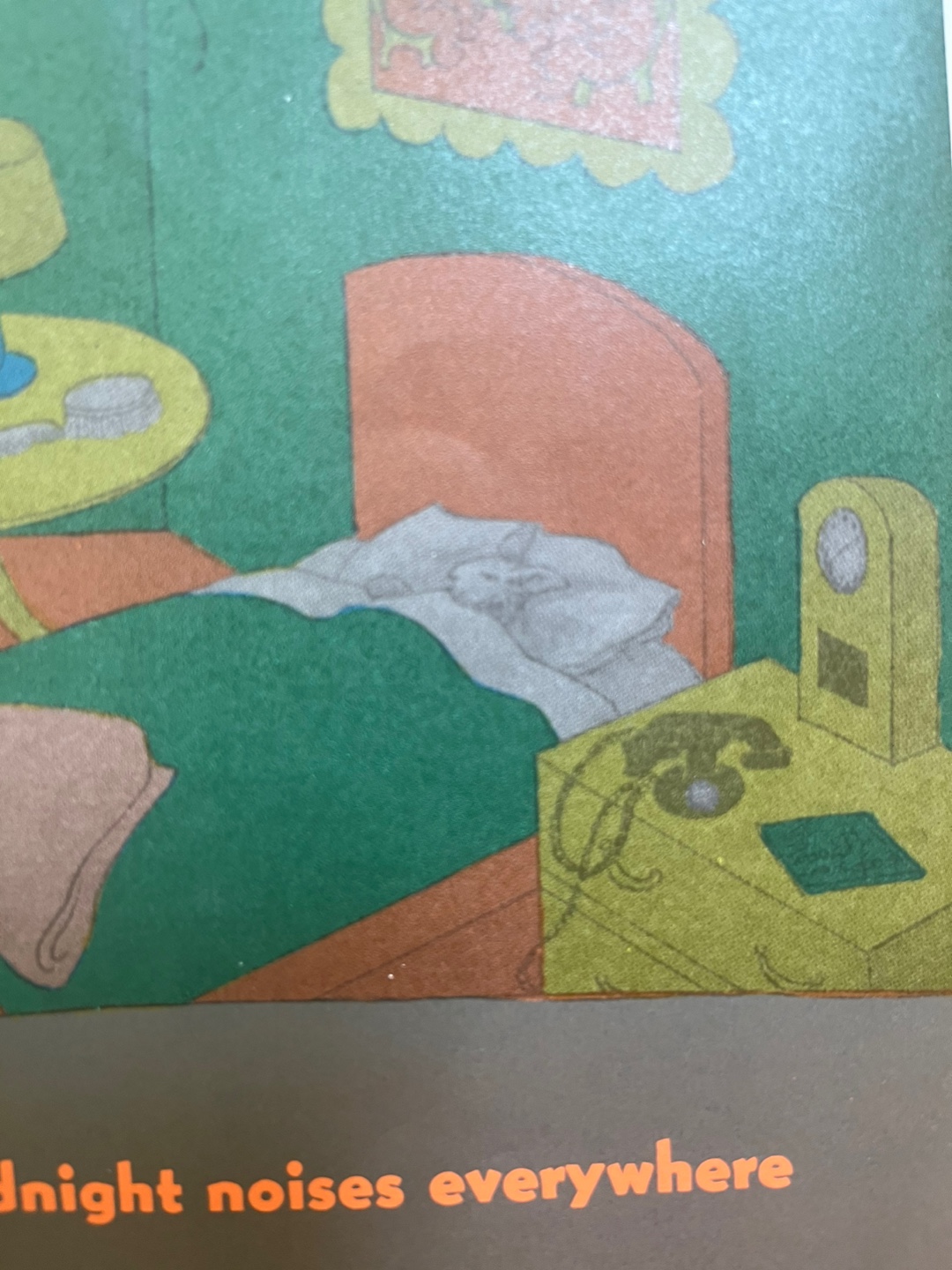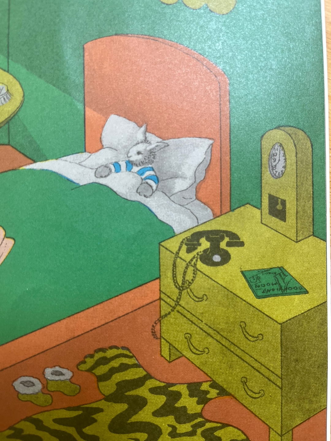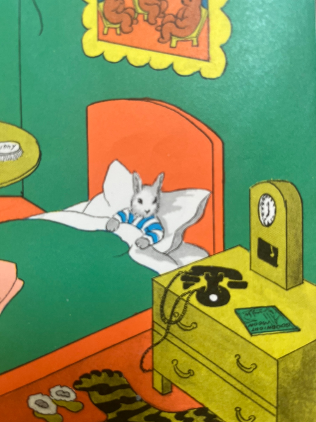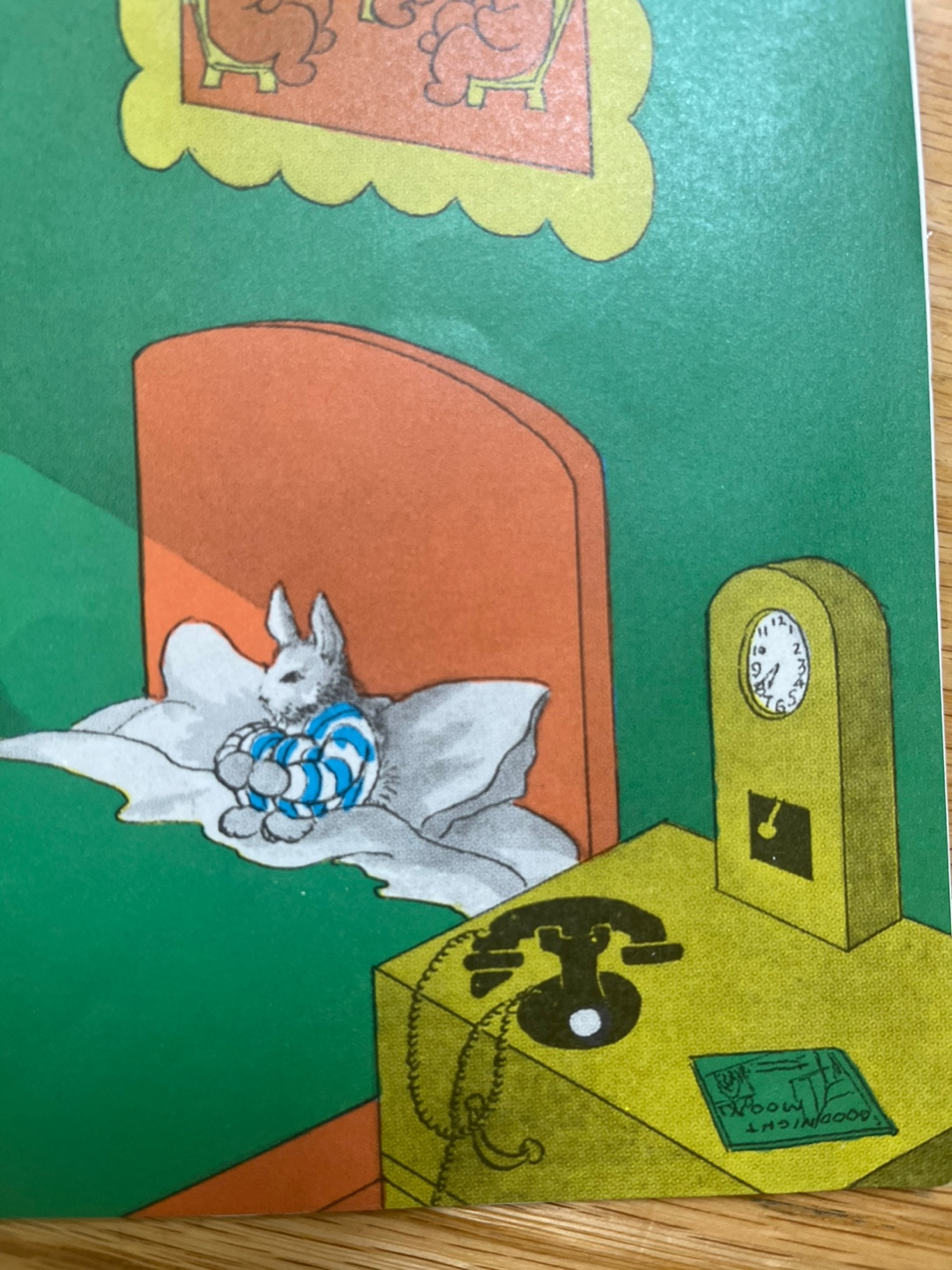 방 안에 걸려있는 그림에게 인사를 건냅니다. 7시 10분이 되자 고양이, 장갑, 장난감 집, 그리고 작은 생쥐에게까지 인사를 하네요. 7시 20분이 됐습니다. 토끼는 여전히 밤 인사를 하고 있어요. 30분에도 40분에도, 10분 간격으로 인사 행렬을 이어가다 마침내 8시 10분이 되자 수면등이 꺼지고 인사를 마칩니다.