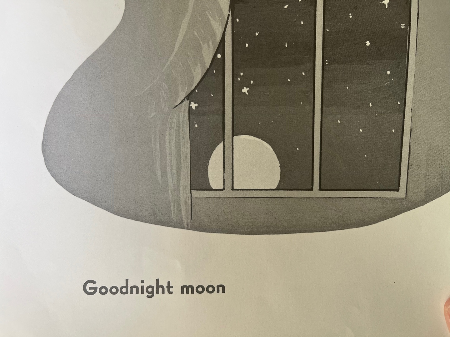 잠자리 독서에 제격인 'Good night moon'입니다. 저는 자기 전엔 서정적이고 자극적이지 않은 책을 읽어주기 좋아해요. 이 책은 여섯 살 둘째 아들의 애착책이어서 잠 자기 전에 꼭 한 번씩 읽고 잤던 책입니다.