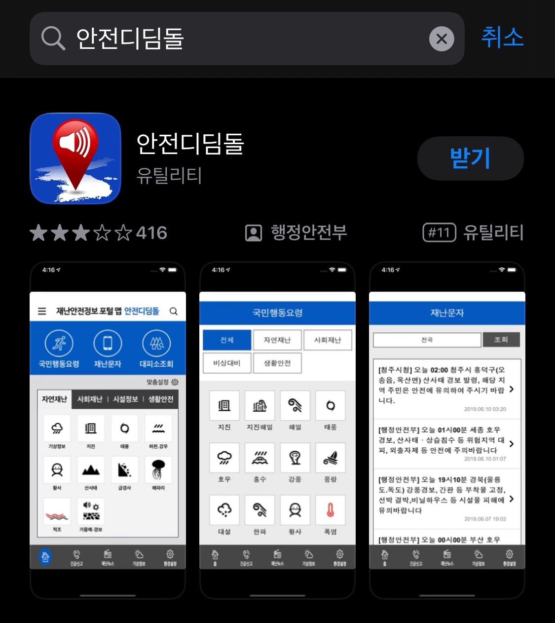 긴급재난문자 알림 소리는 싫지만 내용은 전달받고 싶다면 '안전디딤돌' 앱을 활용해 보세요. 저도 이 참에 다운로드해 봤습니다.