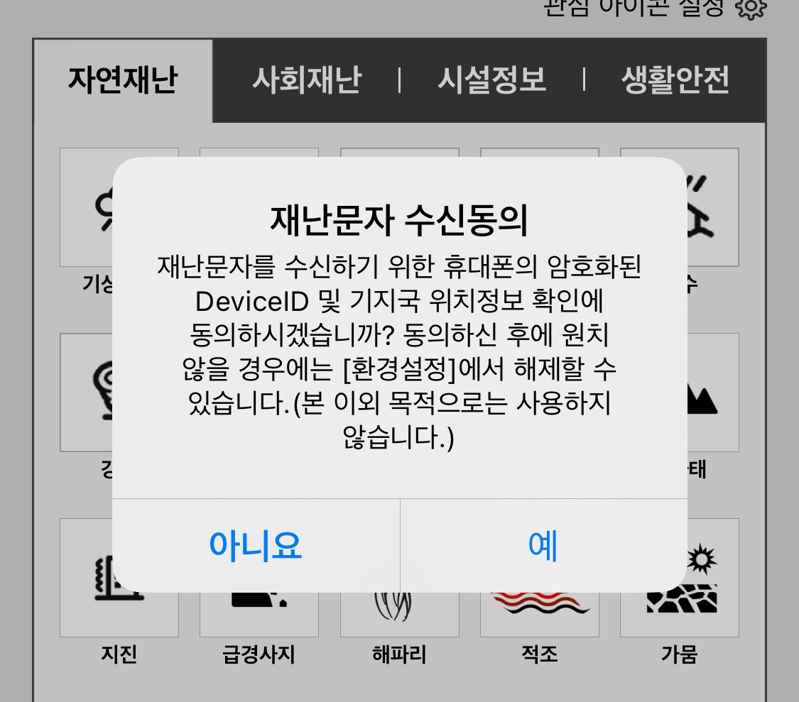 2) 위치정보 동의 후 재난문자 수신동의 '예'를 선택해 주세요.