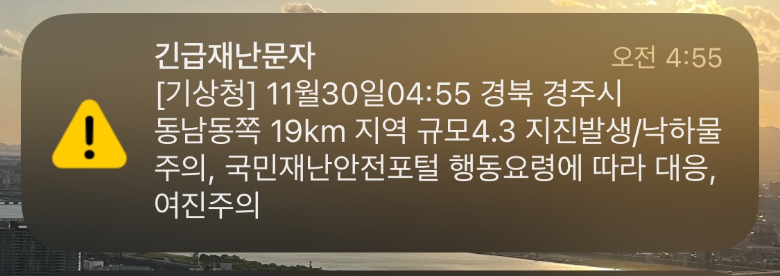 오늘 오전 4시 55분, 경북 경주시 인근 규모 4.3 지진이 발생했습니다. 규모 3.5 이상 6 미만의 지진발생, 혹은 테러 발생 시 40 데시벨의 경보음과 함께 긴급재난문자가 발송됩니다.