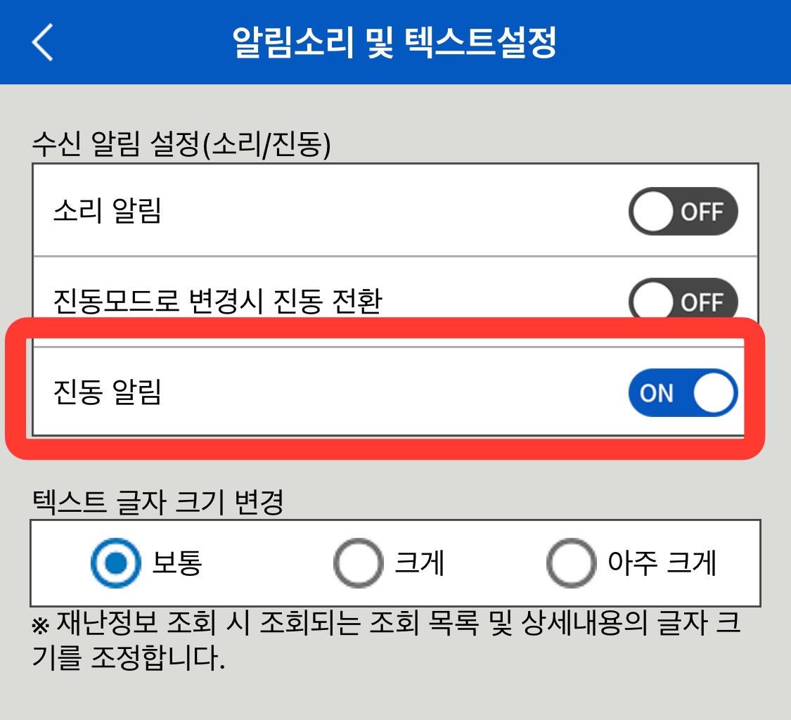 4) '알림소리 및 텍스트설정' 선택 후 '진동 알림' 버튼만 ON으로 활성화시켜주세요.