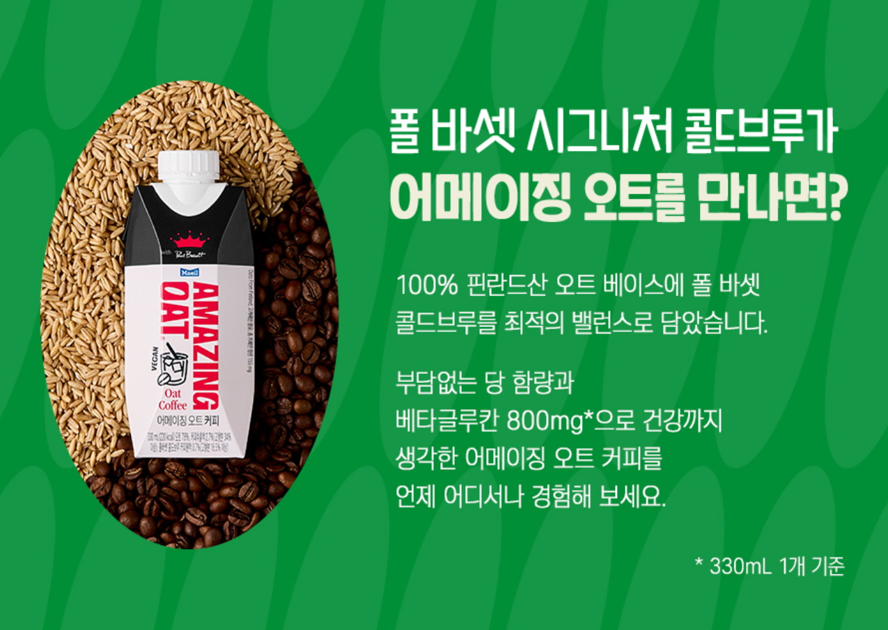 최근엔 폴바셋 시그니처 콜드브루에 어메이징 오트를 최적의 밸런스로 담아냈다는 '어메이징 오트 커피'가 새로 나왔다고 해요. 아직 맛을 보진 않았지만 폴바셋과 어메이징 오트의 만남이라니 벌써 기대가 됩니다.