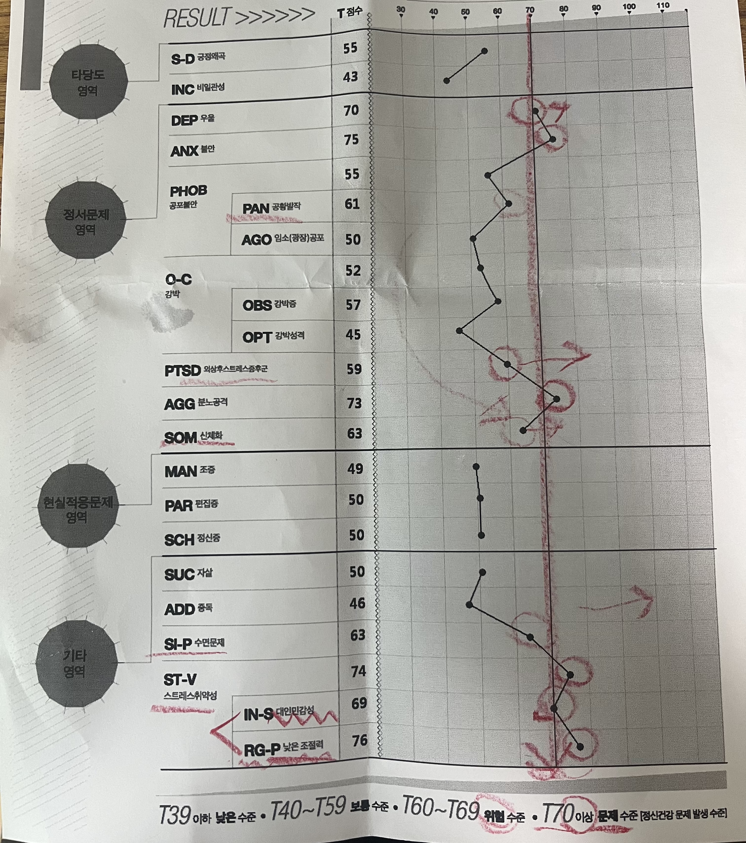 결과가 바로 나오는 검사 도구라 결과지를 보면서 30분 이상 의사 선생님과 이야기를 나누었습니다. 70점을 넘으면 문제가 있는 것입니다.