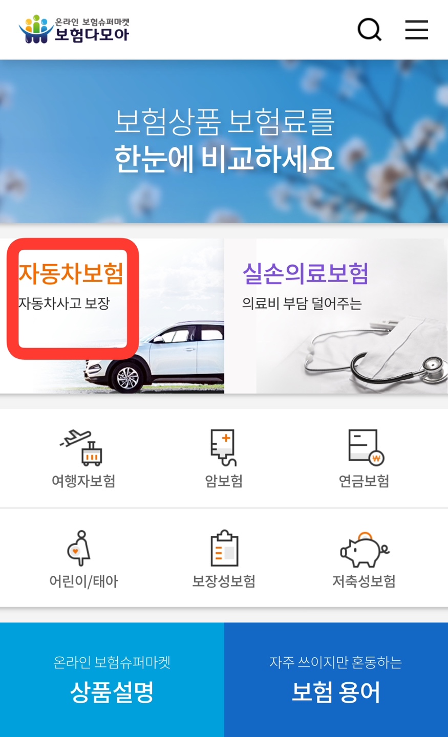 1) 보험다모아 사이트에 들어가 메인화면 '자동차보험'을 눌러주세요.