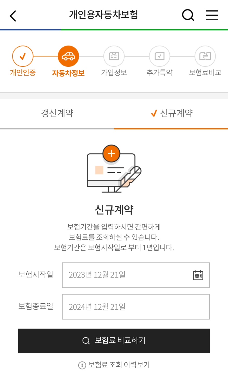 기존 자동차보험이 1개월 이내에 만료되시는 분들은 갱신계약을 선택하시고, 신규가입이나 자동차보험 만기일이 넉넉하게 남은 분들은 신규계약으로 선택하신 후 확인해 보시면 됩니다.