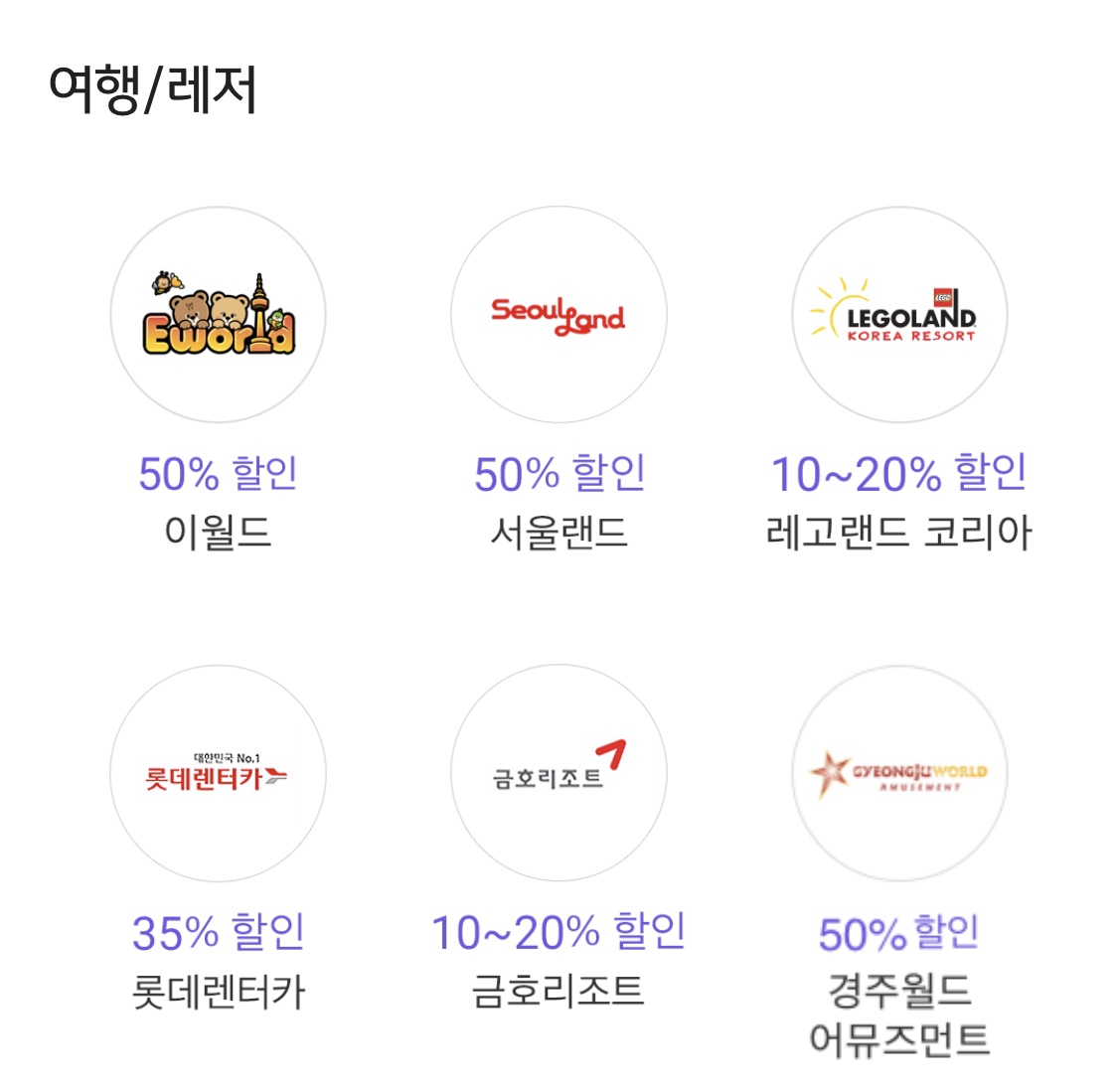 롯데카드와 마찬가지로 여행, 레저, 워터파크 등 다양한 할인혜택을 제공하고 있습니다.