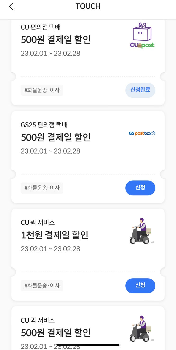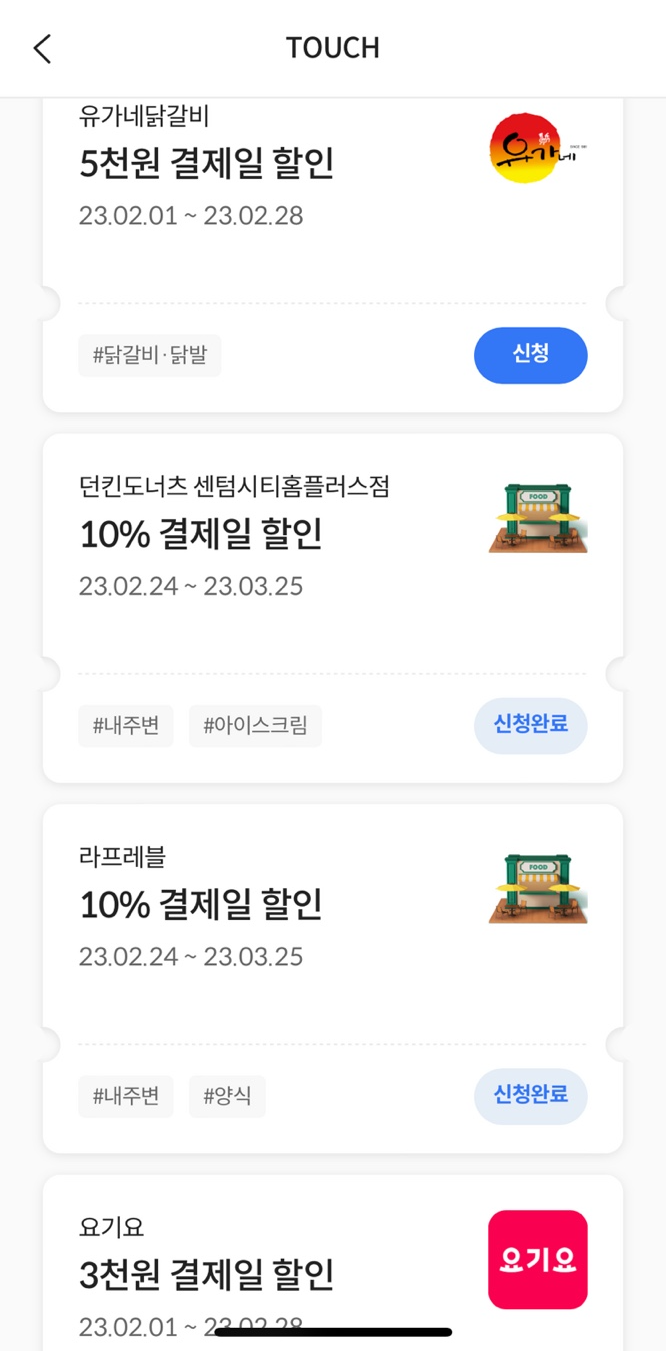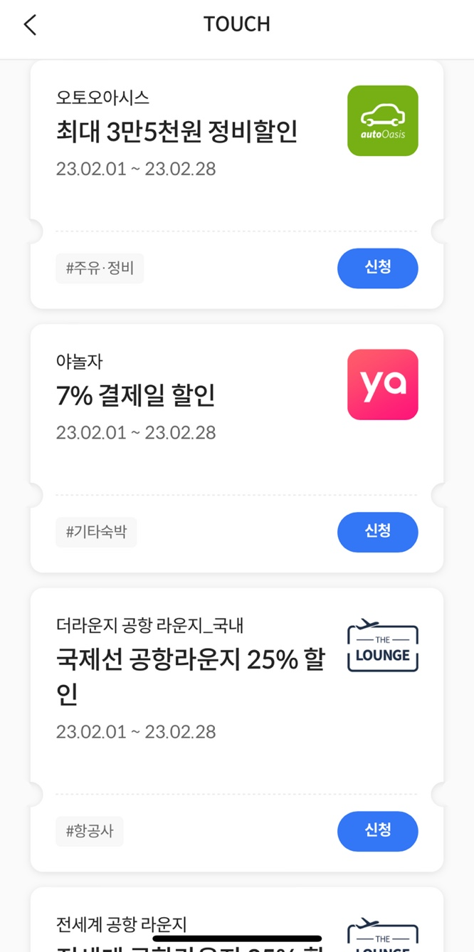 로카 앱에서 할인받고 싶은 항목을 터치하면 할인을 받을 수 있습니다. '신청완료'는 제가 터치한 항목, '신청'은 선택하지 않은 항목입니다.