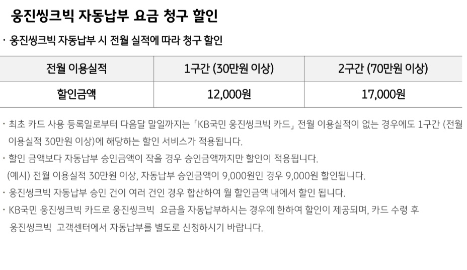 * KB 웅진씽크빅 카드 프로모션 시 '30만 원 이상' 구간만 3000원 추가 할인, 최대 24개월