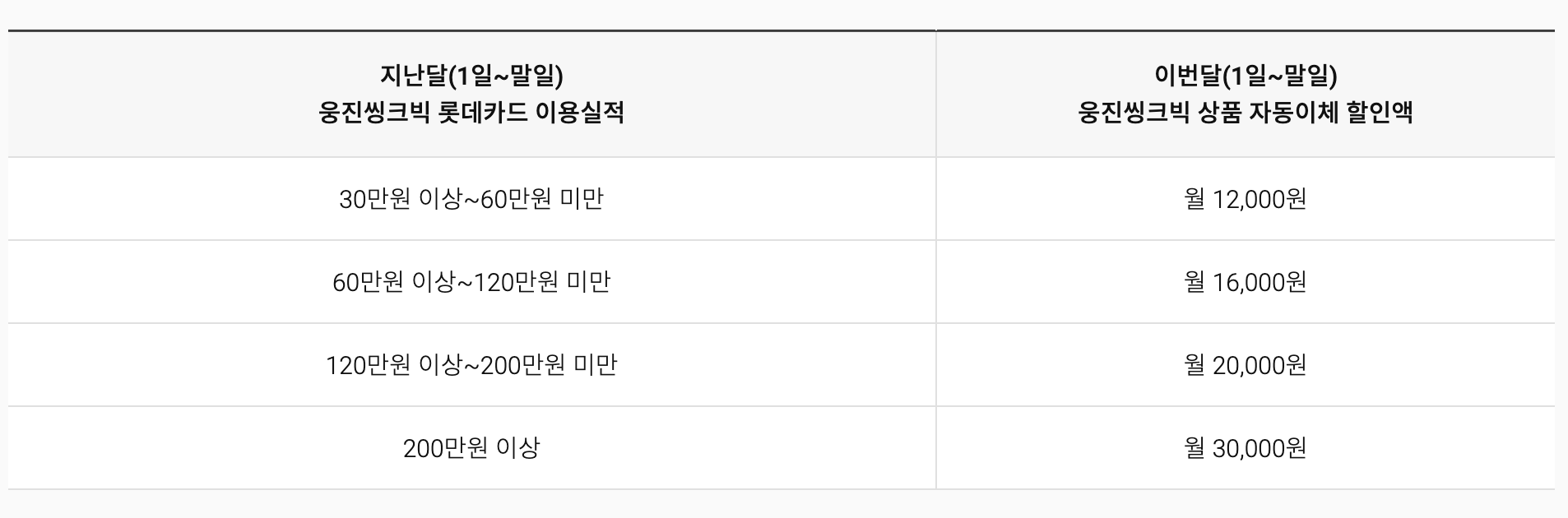 롯데카드와 마찬가지로 전 월 30만원 이상 사용 시 12,000원이 할인됩니다. 또한 첫 달은 전월 이용실적이 없다라도 12,000원 할인이 적용돼요. 다만 롯데카드는 이용금액이 많아질수록 KB 웅진씽크빅 카드에 비해 할인 금액이 커집니다.