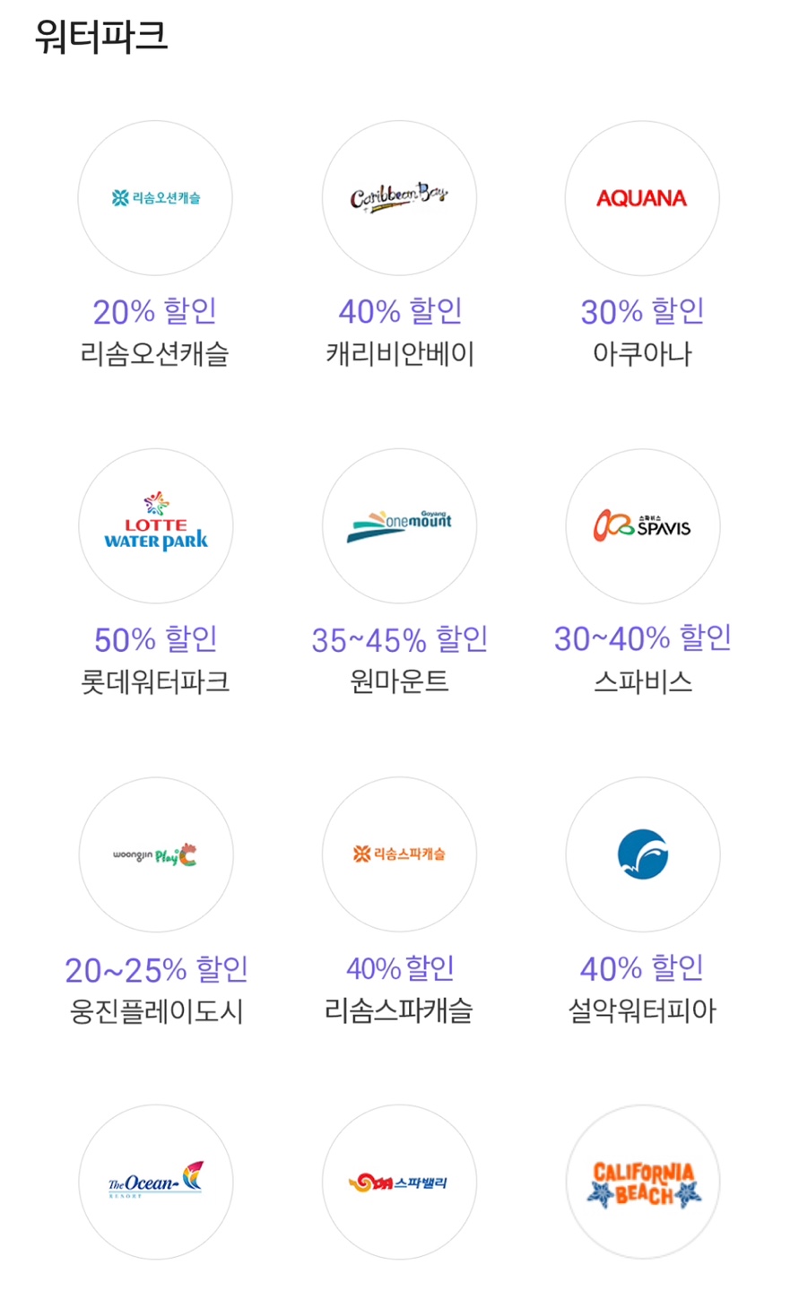 롯데카드와 마찬가지로 여행, 레저, 워터파크 등 다양한 할인혜택을 제공하고 있습니다.