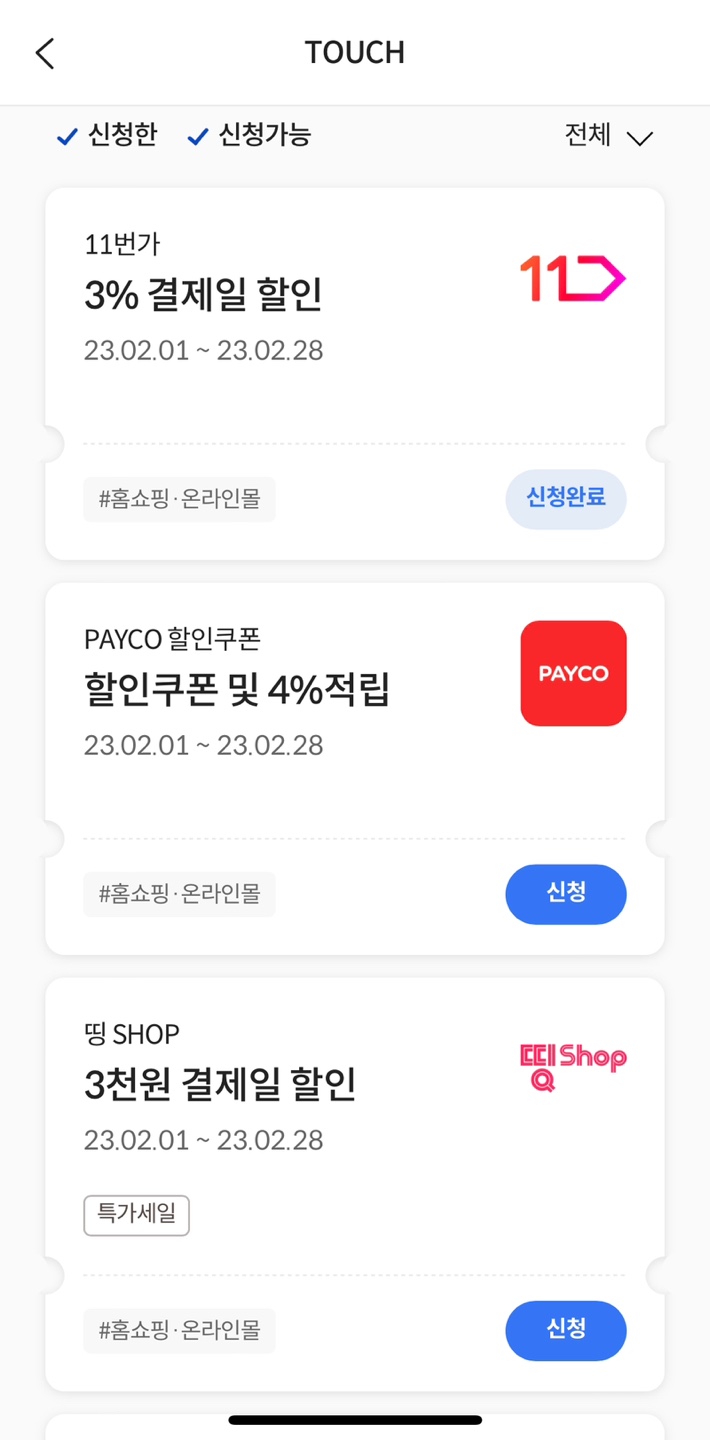 로카 앱에서 할인받고 싶은 항목을 터치하면 할인을 받을 수 있습니다. '신청완료'는 제가 터치한 항목, '신청'은 선택하지 않은 항목입니다.