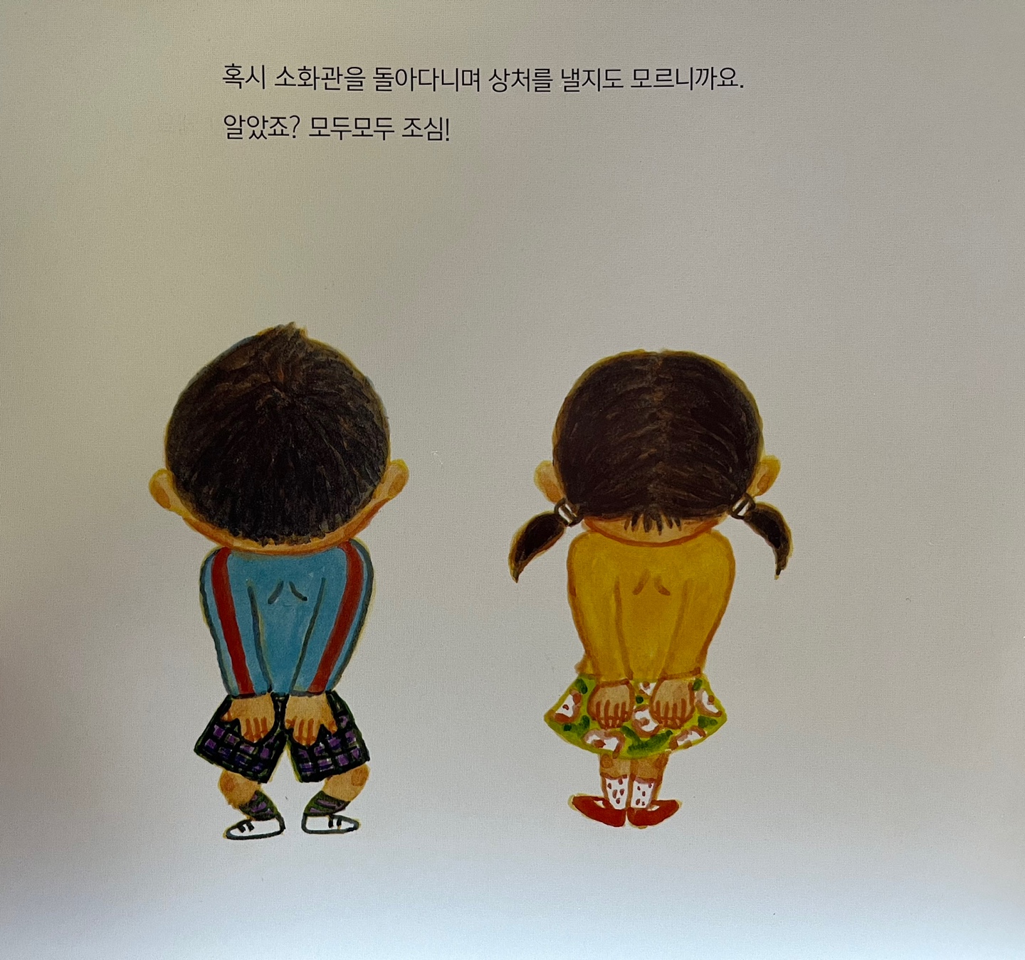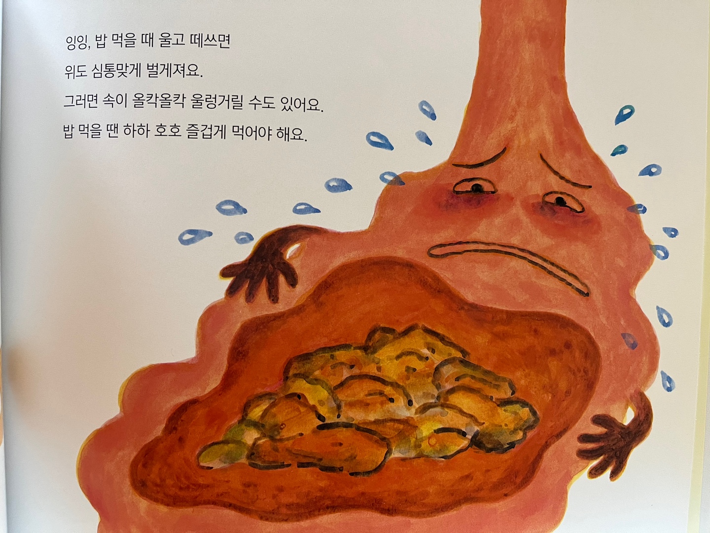 밥 먹을 때 울고 떼를 쓰면 소화기관인 '위'도 심통맞게 벌게져요. 음식을 기분 좋게 먹어야 한다는 것을 재미있게 표현하여, 여섯 살 둘째 아이의 눈높이에 딱 맞았어요. 식사시간에 가만히 있지 못하는 아이인데 "위가 심통 나겠다!"라고 말하면 잠시나마 잠잠해집니다 :D