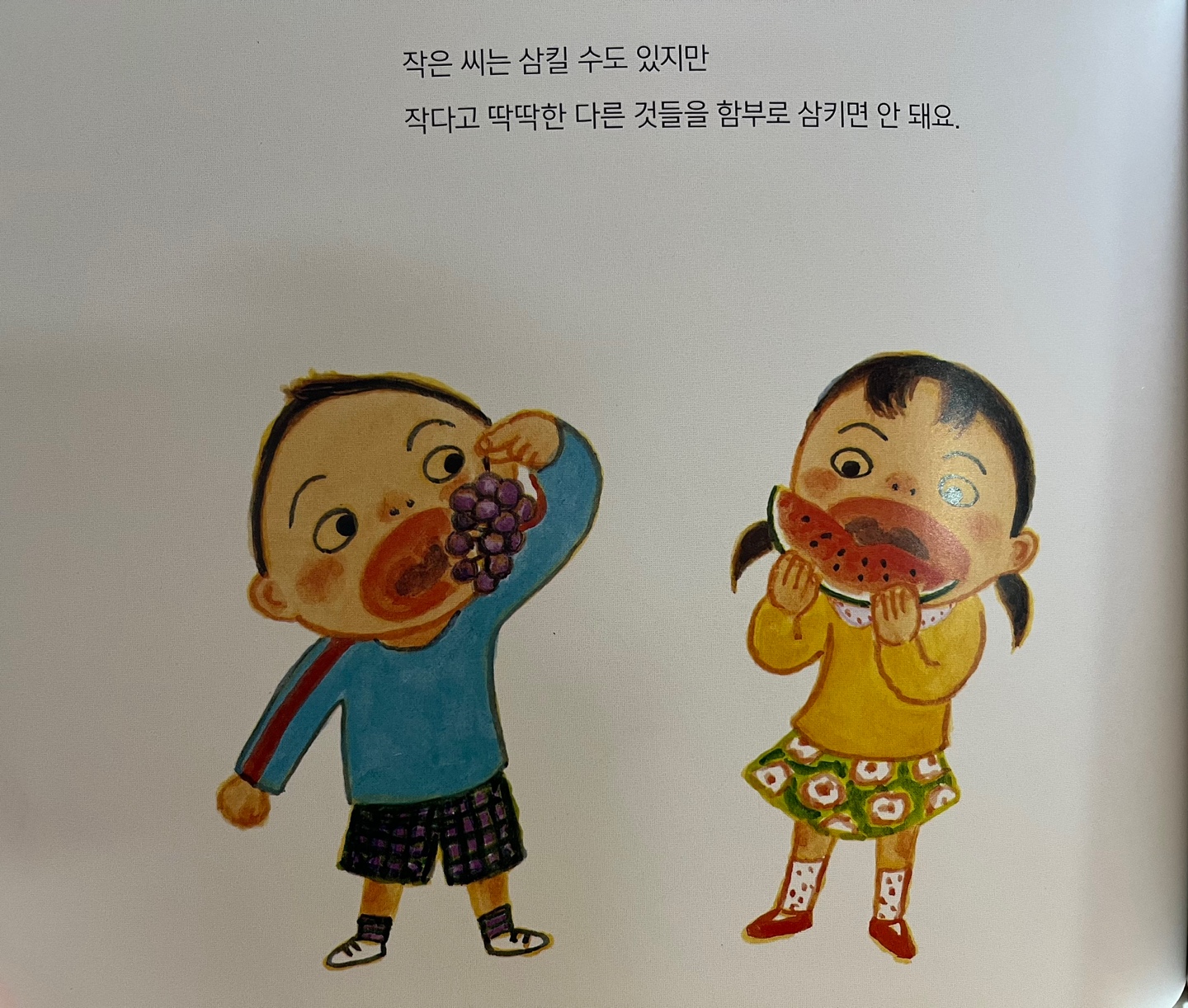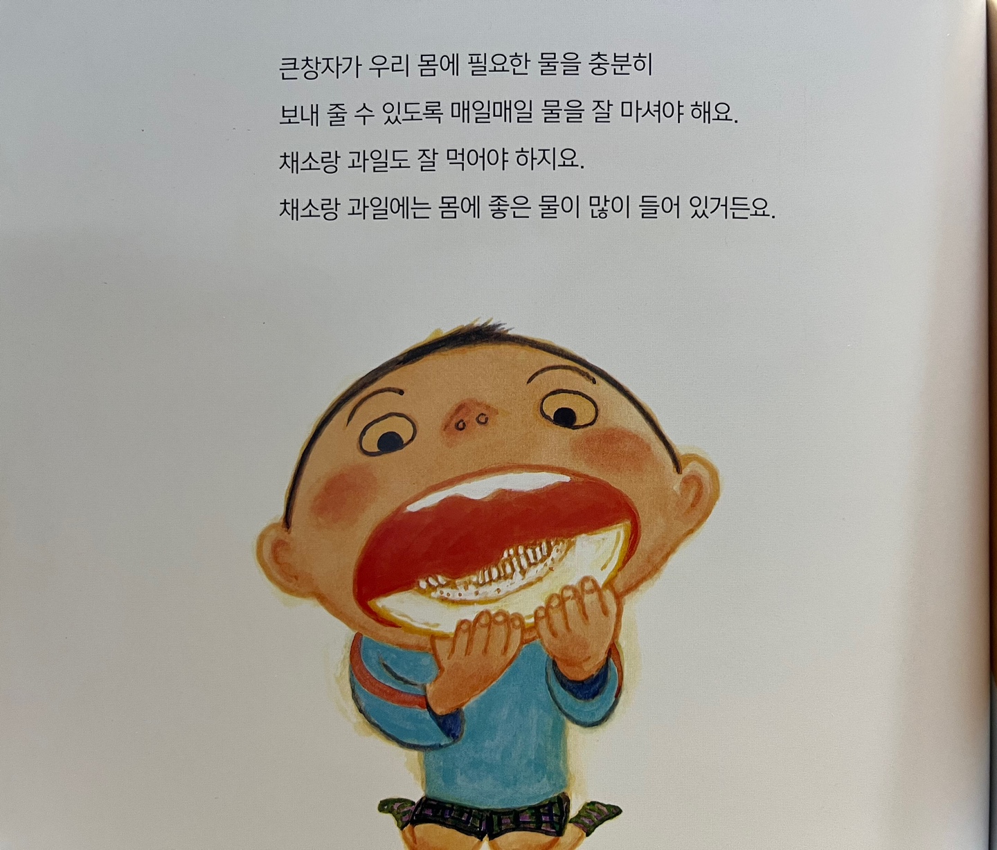 우리 집 아이들은 물을 잘 마시지 않아요. 그래서 제가 생각날 때마다 한 번씩 챙겨주곤 하죠. 이 책은 물을 충분히 마시지 않거나, 음식을 잘 씹지 않거나, 씨를 삼켰을 때 우리 몸에 나쁜 영향을 끼칠 수 있다는 것을 알려줍니다. 제가 백 번 잔소리하며 쫓아다니는 것보다 함께 책을 읽어 이해하고 배웠을 때 더 쉽게 받아들이는 것 같습니다.